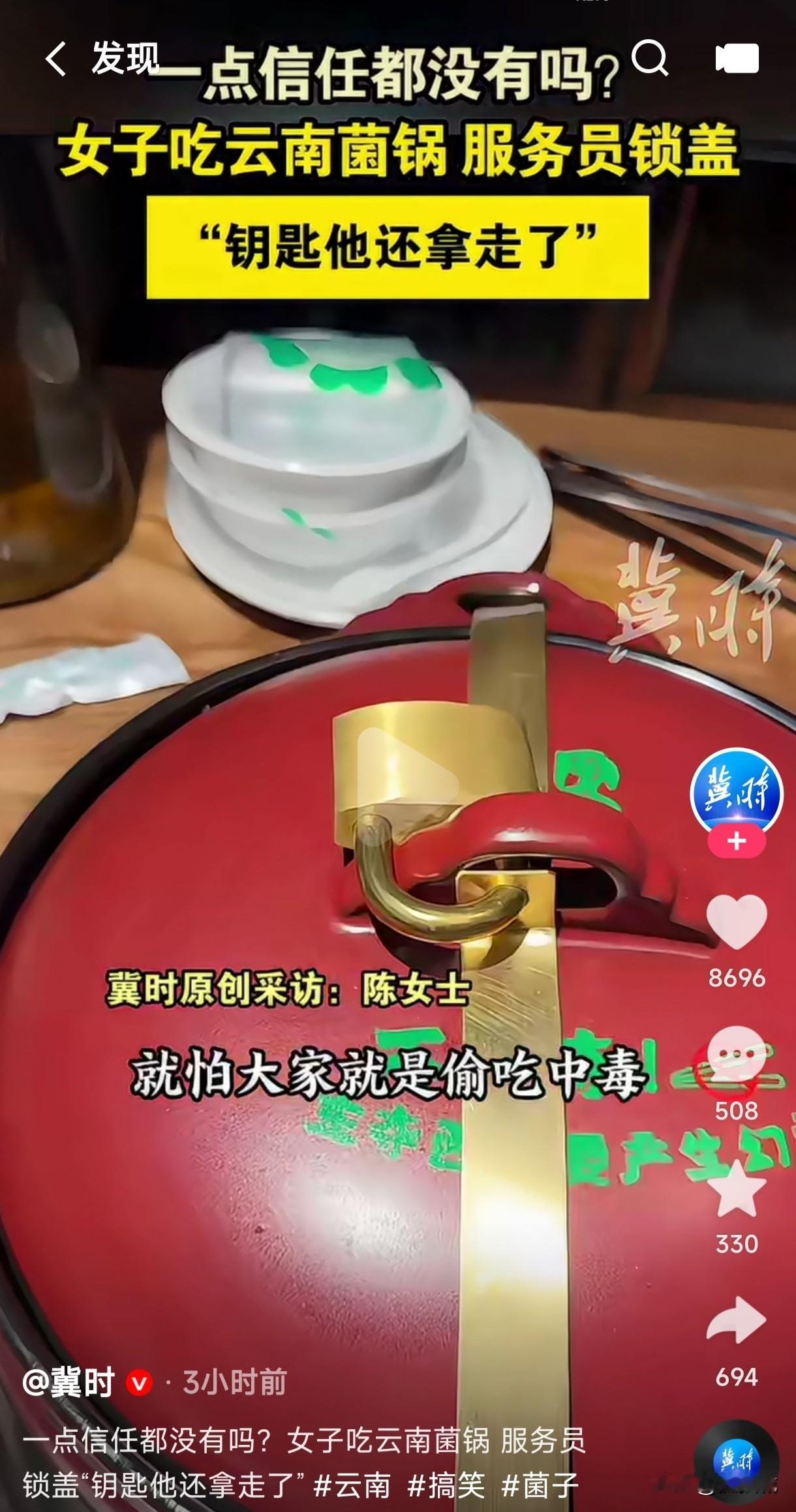 所有的云南菌锅服务员都会锁锅吗? 女子吃云南菌锅,服务员居然拿了一把锁把锅给锁起来了,钥匙也被服务员拿走了,这是一点信任都没有吗? 从来没有吃过云南菌锅,第一次知道吃云南菌锅会被服务员锁锅,原来云南菌锅是要煮20分钟才能吃,店家这样做就是怕有人偷吃会中毒,所以才想出了这么一个办法,钥匙被服务员拿走也是在情理之中,等时间到了服务员在来拿钥匙开锁吃菌锅也没任何问题,这也不是彼此之间不信任,而是服务到位。 可见云南菌锅的店家服务是如此的到位,这既让客人吃的放心安全,又防止了不怀好意的人敲诈讹人,两全其美的办法不是很好吗?