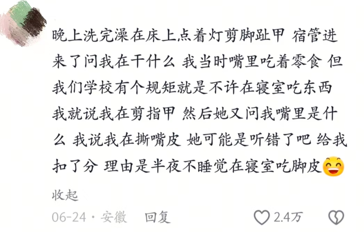 理由是半夜不睡觉在寝室吃脚,哈哈