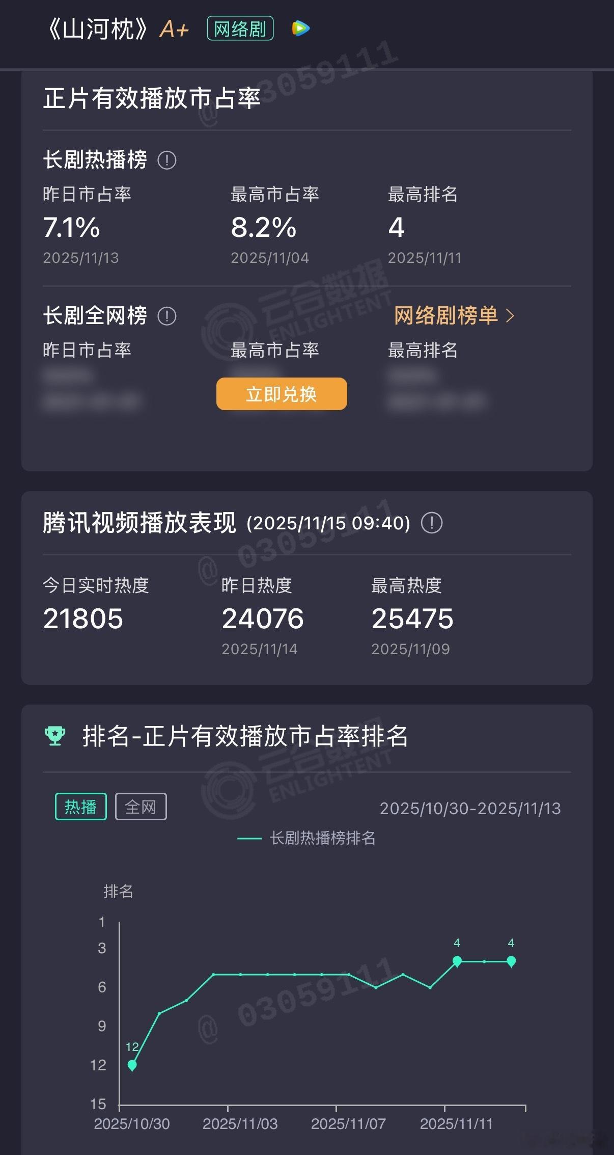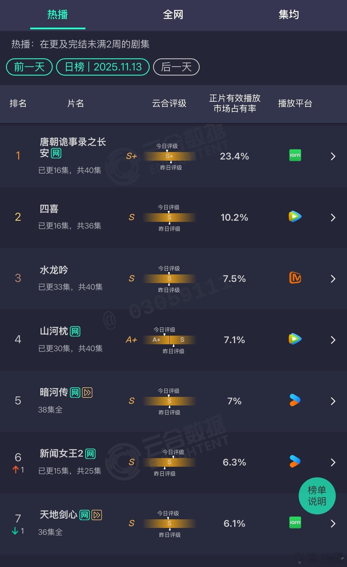 宋茜 丁禹兮《山河枕》云合评级从S跌到了A+,好像是近期播出剧里的头一回……目前云合集均655w,也是近期剧里最差的,最后热播期集均能到1000w吗?