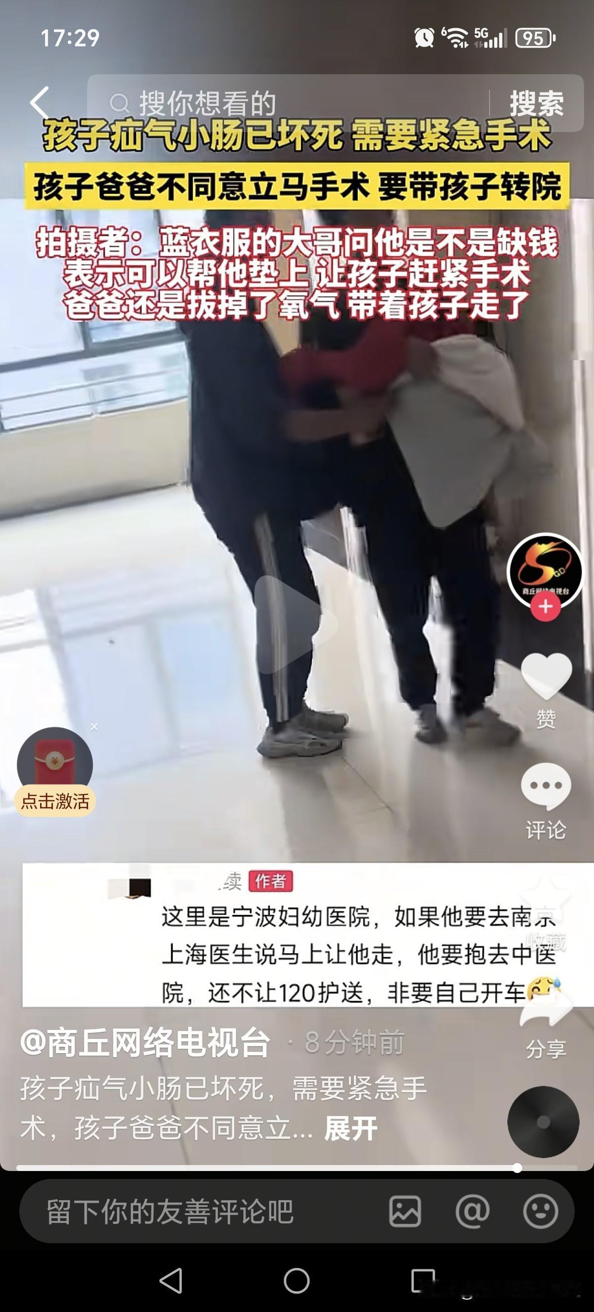 “真的被这位爸爸气死了!”孩子疝气肠已经坏死了,医生要求紧急做手术,妈妈急得不行,可是这位爸爸坚持不在这个医院做,两个主任医师和护士跟家属说明情况很危急,都在劝尽快考虑,不要耽误孩子病情,可是这位爸爸坚决不在这个医院做。 事情发生在某城市三甲医院的急诊外科,孩子当天下午突然出现剧烈腹痛,肚子上鼓起一个硬包,哭到脸色发白、浑身冒冷汗,妈妈赶紧抱着孩子赶往最近的三甲医院。 经过 B 超和血液检查,医生确诊是腹股沟疝嵌顿导致肠坏死,这种情况属于外科急症,肠管被疝环紧紧卡住后血液循环完全中断,超过 4 到 6 小时就可能引发腹膜炎、感染性休克,死亡率高达 10%-20%,必须立刻进行手术切除坏死肠管并修补腹壁缺损。 接诊的主任医师一边安排护士给孩子输液抗感染,一边赶紧找家属沟通手术事宜,可没想到孩子爸爸一听到要马上手术,当场就提出了反对。 他表示自己不信任这家医院的水平,坚持要带孩子转去另一家距离四十多公里的专科医院,哪怕医生已经明确告知,转院路上的颠簸和时间消耗可能让孩子病情恶化,甚至在途中就出现休克,他依然固执己见。 孩子妈妈当场就急哭了,拉着丈夫的胳膊哀求他别再耽误时间,可丈夫反而指责她不懂医学常识,说这家医院的手术费用太高,而且专科医院在疝气治疗上更有经验。 为了打消他的顾虑,两位主任医师特意拿出医院过往的手术成功率数据,解释儿童疝气修补术已经是非常成熟的微创手术,创伤小、恢复快,术后一两天就能出院,复发率不足 1%,甚至承诺会亲自上台手术,可这些话都没能动摇这位爸爸的决定。 护士们也轮流过来劝说,拿着医学手册给他讲解肠坏死的严重性,告诉他一旦细菌和毒素扩散到腹腔,可能引发多器官功能衰竭,到时候再手术也回天乏术。 但这位爸爸只是低头刷着手机,偶尔抬头反驳几句,说自己查过资料,有些孩子疝气能自行愈合,就算嵌顿也不一定会立刻坏死,还质疑医生是为了赚钱才故意夸大病情。 急诊室里的气氛越来越紧张,孩子的哭声越来越微弱,监测仪器上的心率数值持续偏高,血压却在慢慢下降。医生已经启动了应急预案,手术间和麻醉团队都已就位,就等家属签字确认。 孩子妈妈急得直跺脚,试图自己签字,却被医院告知按照规定,这类重大手术需要监护人共同同意,除非有一方能提供另一方无民事行为能力的证明,否则无法单独签字。 周围候诊的患者和家属都忍不住围过来劝说,有人分享自己孩子类似的就医经历,有人提醒他转院路上的风险,可这位爸爸依旧不为所动,还打电话联系朋友帮忙预约所谓的专科医院,完全没注意到孩子的脸色已经从苍白变成了青灰。 医生只能一边继续给孩子采取急救措施维持生命体征,一边让医务科介入协调,同时报警请求警方协助沟通,希望能尽快说服这位固执的父亲,可这位爸爸却被自己的偏见和误解困住,让孩子陷入危险境地。 急诊室里的每一个人都在为孩子揪心,医生和护士们没有放弃劝说,孩子妈妈的哭声一直没停,而时间还在不停流逝,所有人都在盼着这位爸爸能早日认清现实,签下那份关乎孩子生命的手术同意书。 对此,你们有什么看法,欢迎评论留言~