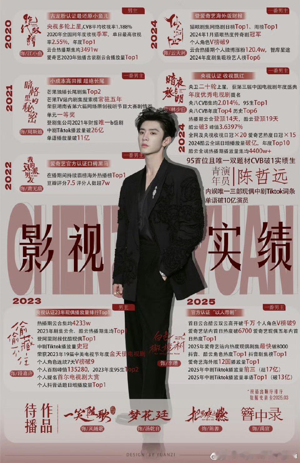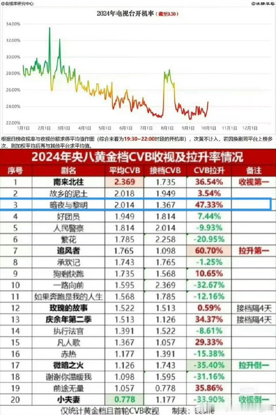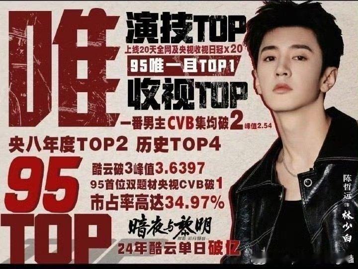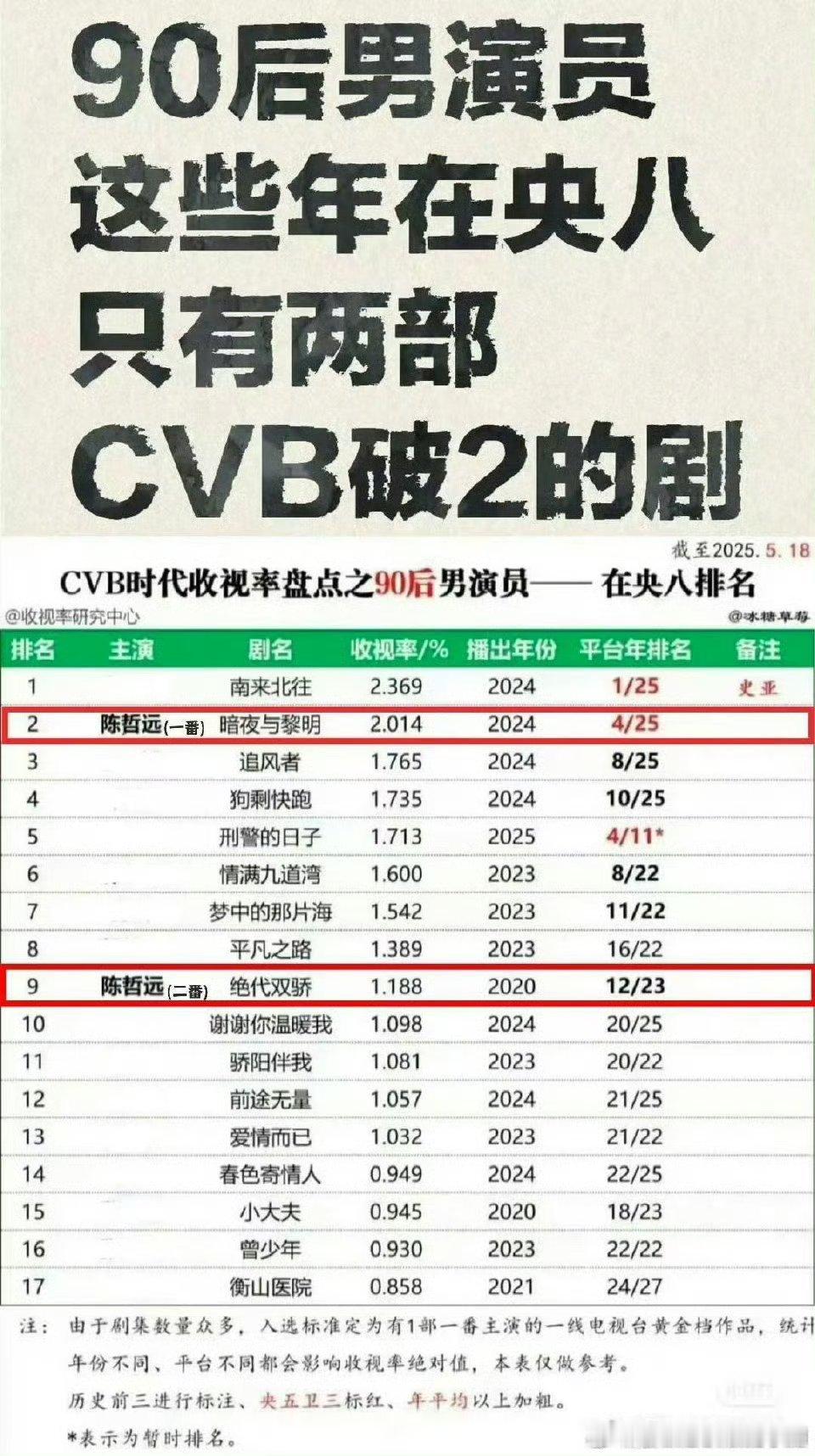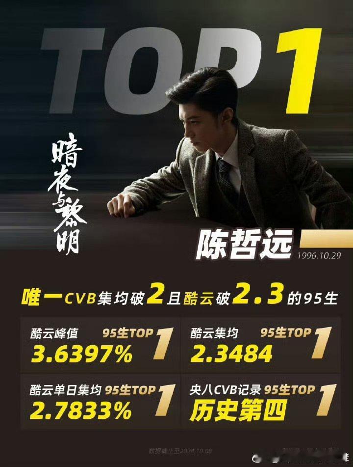 陈哲远一番大爆剧《暗夜与黎明》,cvb均集破2.014,拉升率47.3%,央八年度top2,酷云收视率峰值破3. 6379,热播期单日播放量就破亿,酷云全端热播期是4492w,陈哲远扛剧生就是🐮!