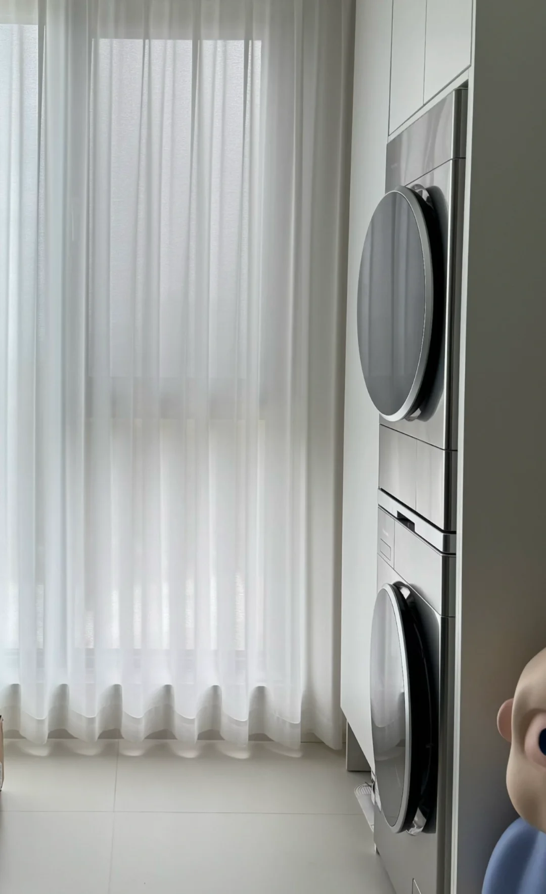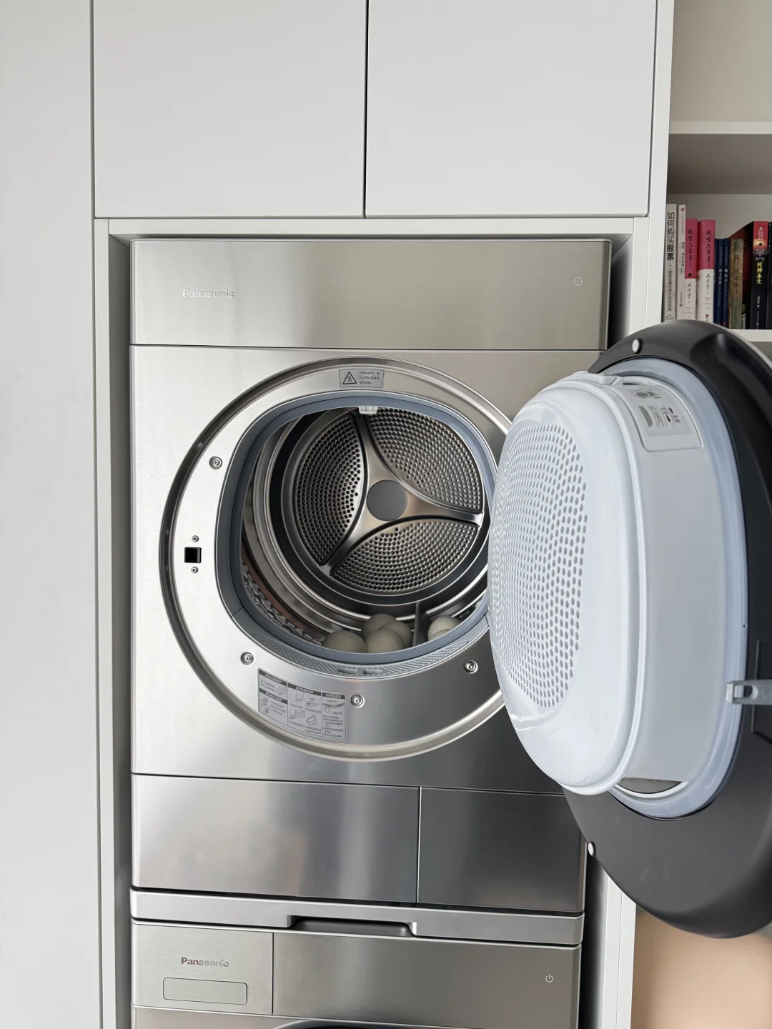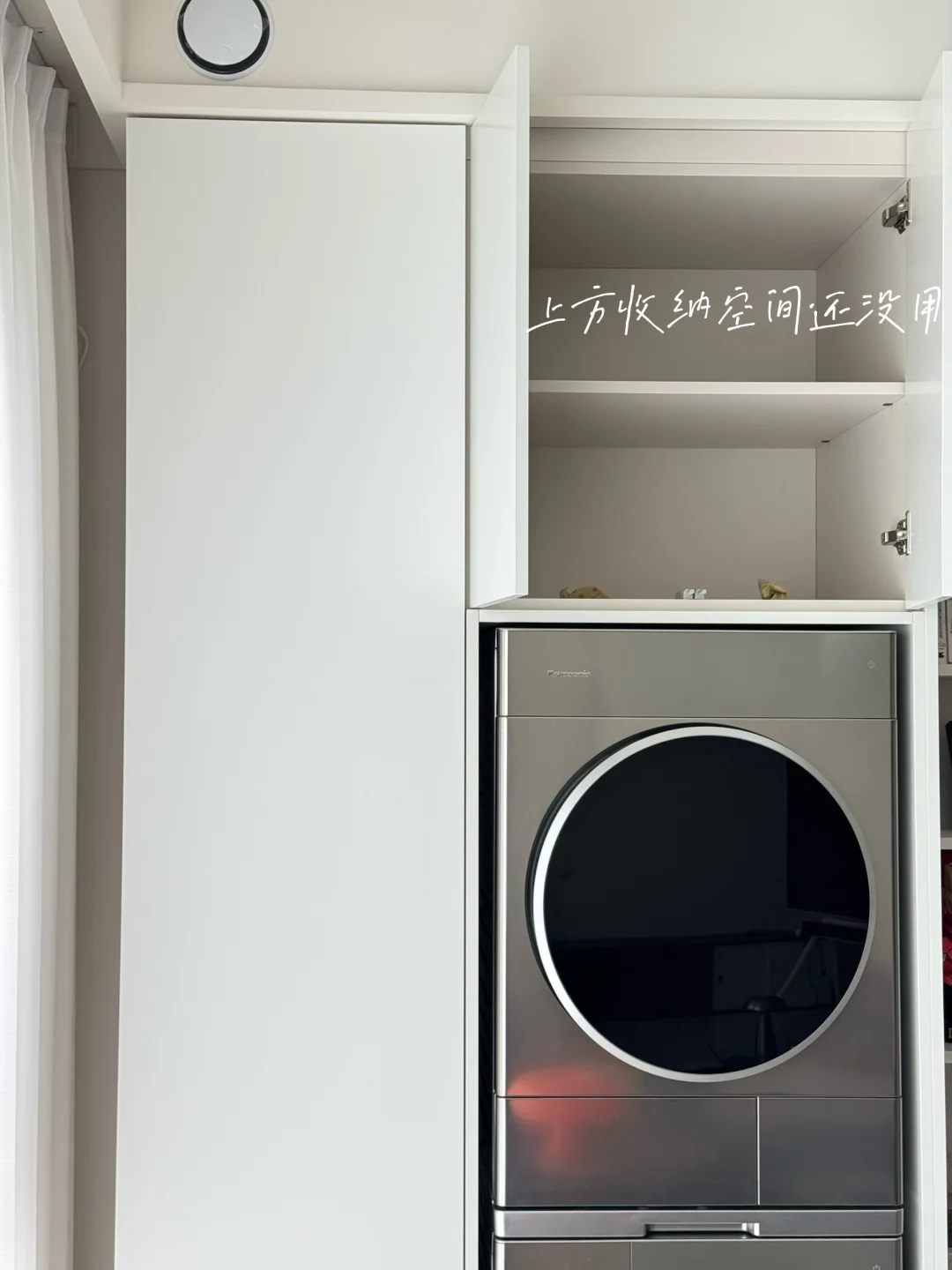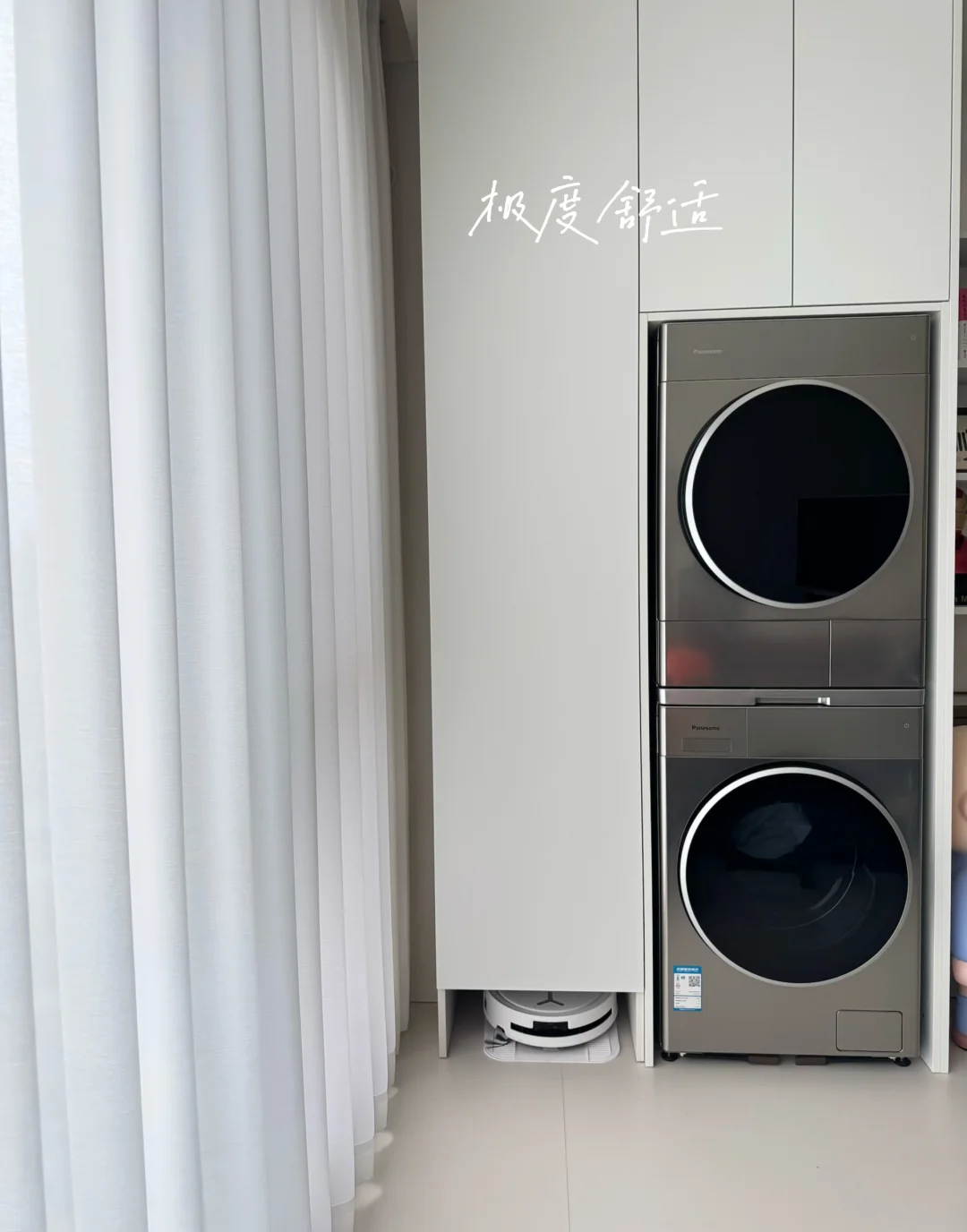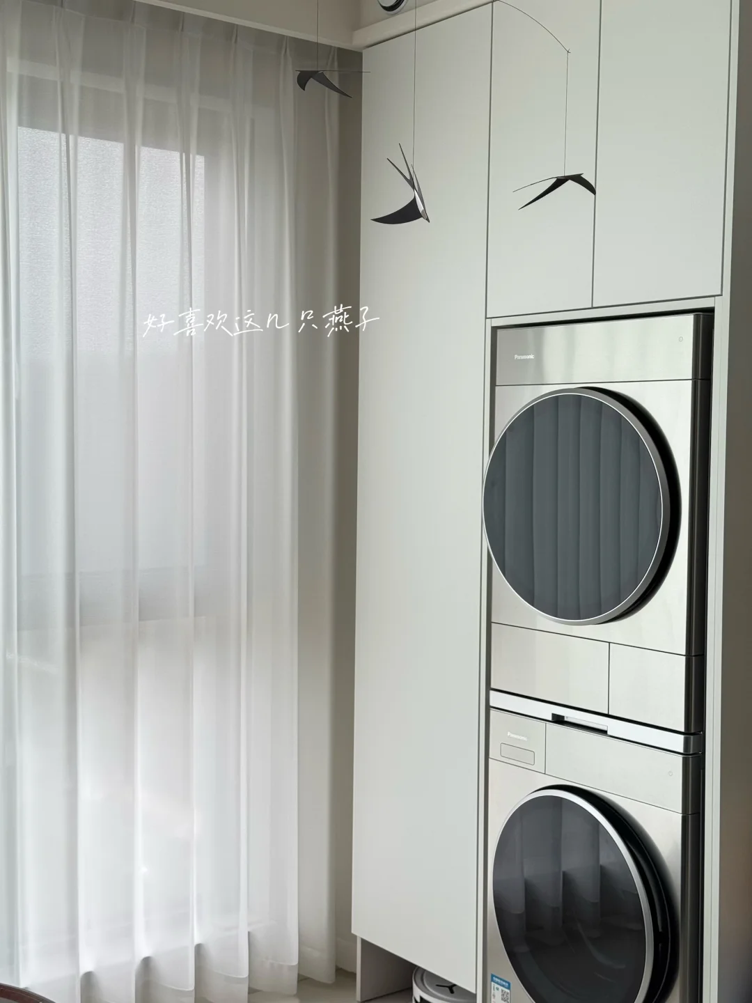 白色柜子配银色洗衣机太好看了 个人觉得比白色更耐看 阳台没有留单独小水池太明智了 因为懒人洗衣机那是一点也不能动手 小衣服还有内衣洗衣机足够了 全部做成收纳柜子容纳力满满 - 记得一定留好机器人的位置 上下水电源留好可以完美隐藏 洗衣机和烘干机也是严丝合缝 强迫症看着太舒适 搭配了小燕子挂件阳台更灵动了 -