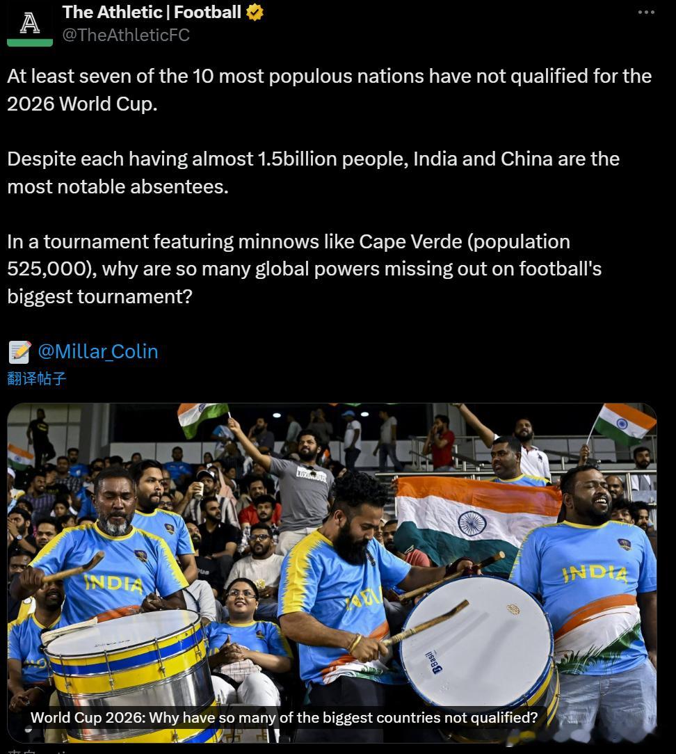【足球水平和人口总数不是正相关】TA:世界人口数排名前10的国家,至少7个确定无缘2026世界杯。目前只有巴西、美国晋级,总人口2.3亿的尼日利亚要参加附加赛。▪️无缘2026世界杯的人口大国:印度,总人口14.6亿,从未参加世界杯中国,总人口14.1亿,参加过1次世界杯印度尼西亚,总人口2.8亿,参加过1次世界杯(荷兰殖民地时期)巴基斯坦,总人口2.5亿,从未参加世界杯孟加拉国,总人口1.7亿,从未参加世界杯俄罗斯,总人口1.4亿,参加过11次世界杯埃塞俄比亚,总人口1.3亿,从未参加过世界杯