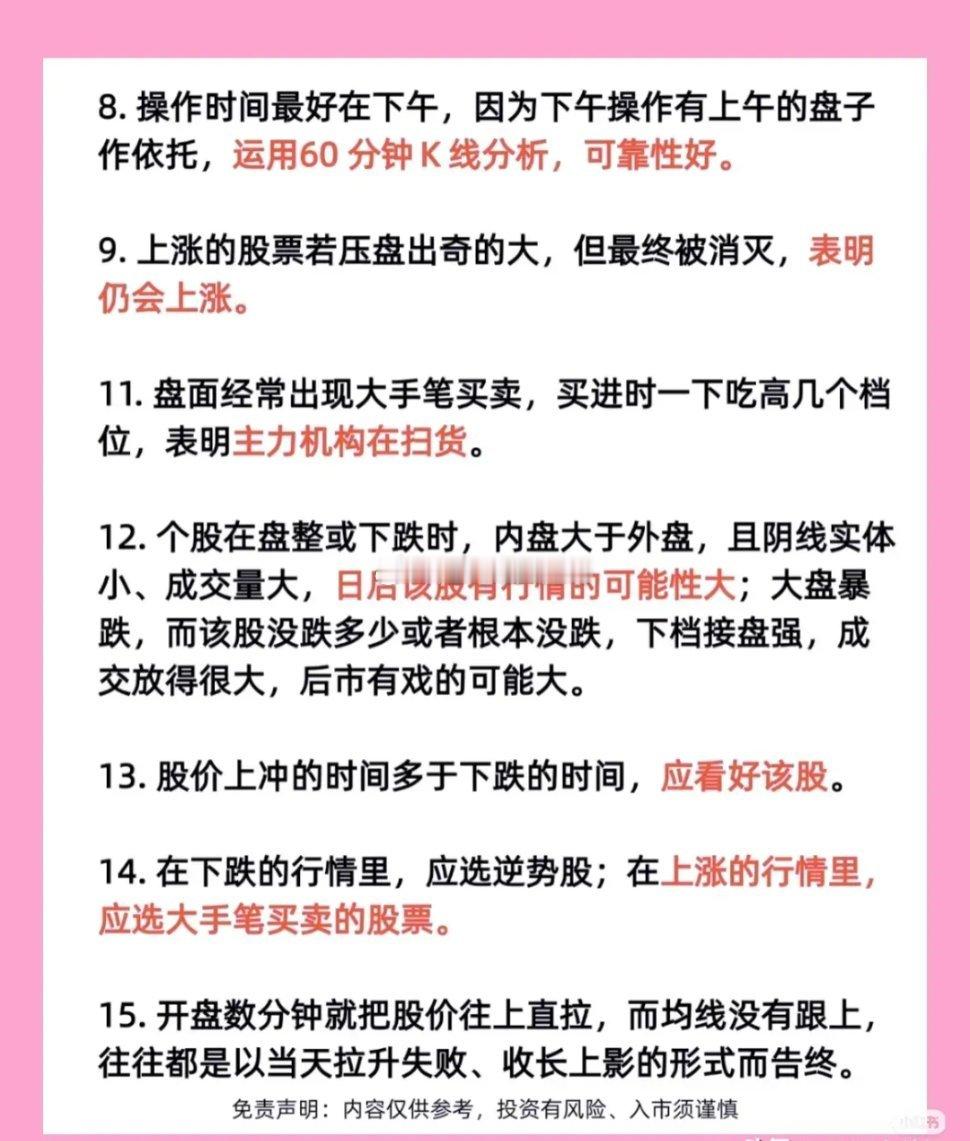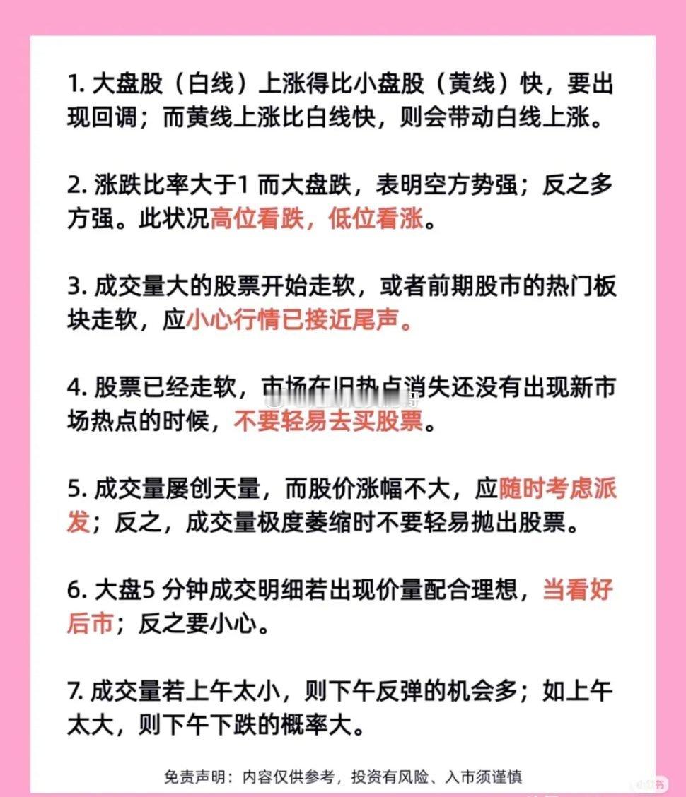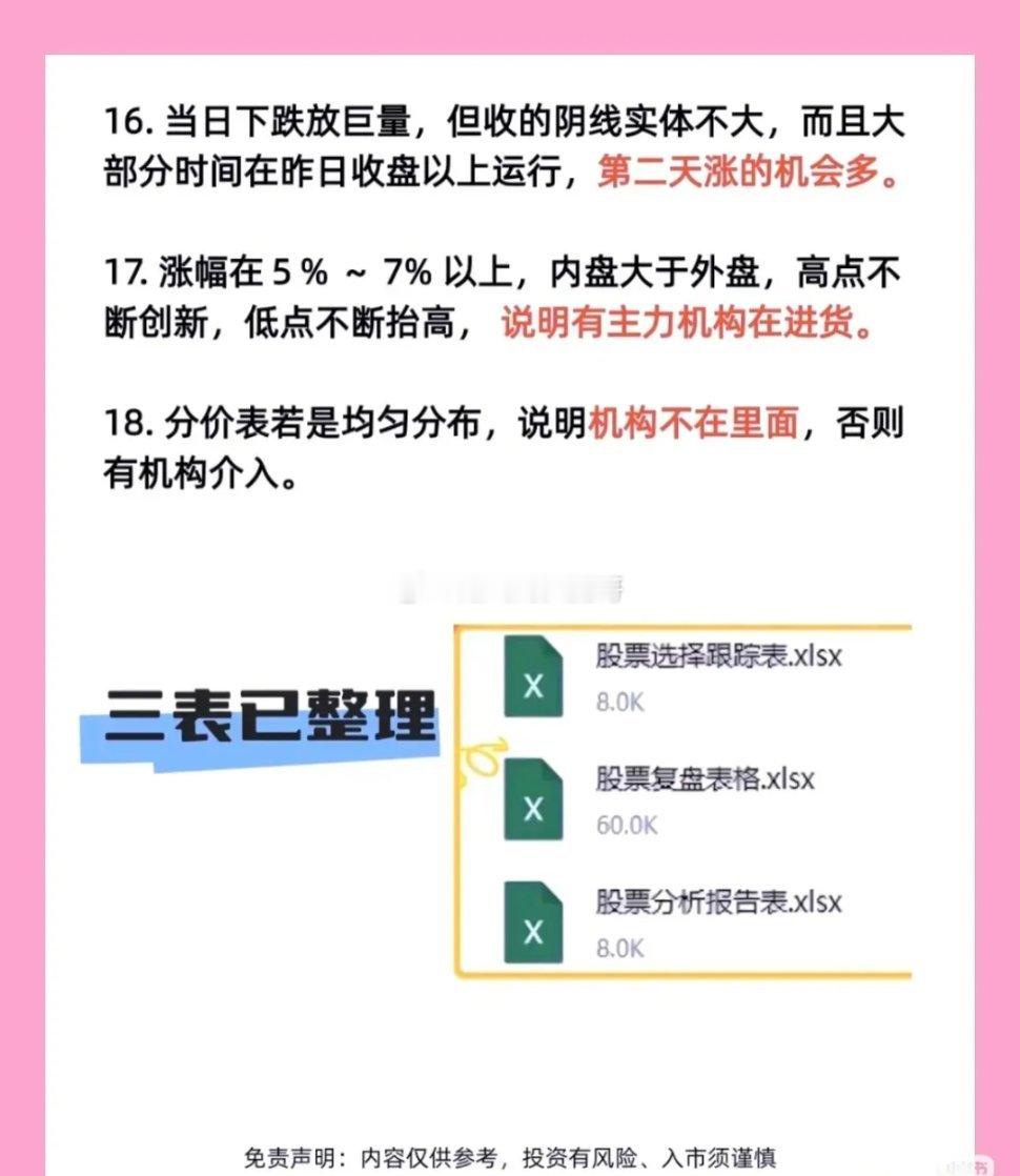 想快速入门股票看盘?这份“看盘十八条”简直是新手福音!从大盘股与小盘股的涨跌联动,到量价关系、主力资金动向,把复杂的盘面信号拆解成了直白的操作指南——比如“黄线涨得比白线快更易带起大盘”“高位涨跌比>1但大盘跌要警惕回调”,连操作时间选下午、60分钟K线更可靠这种细节都标了重点。里面的实战技巧太实用了:成交天量但股价不涨要考虑派发,下跌时逆市抗跌且成交放大的股往往有戏,开盘急拉但均线没跟上大概率收长上影…每一条都是盯盘时能直接对照的信号。最后还配了选股、复盘、分析的表格,等于把工具包都备齐了!不过要记住,这些都是参考思路,市场变化快,结合自身策略和风险承受力才是关键~