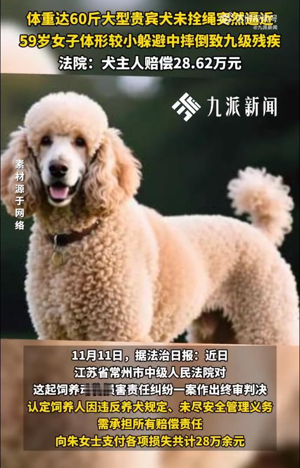 江苏一女子在草坪锻炼时遇到一只未牵绳的大型贵宾犬,吓得摔倒在地上,致腰椎骨折。狗主人将女子送到医院治疗。女子要求狗主人承担全部医药费和后续治疗费。法院咋判? 江苏常州,有一位58岁的朱女士。 这一天,她再当地一家酒店附近的草坪上锻炼时,迎面遇到了一只长80厘米,体重30公斤,站立起来能到朱女士要补的大型贵宾犬。 要命的是,这条大狗没有牵绳。而这条狗的主人则在远处闭目养神。 朱女士身材娇小,而且本来就怕狗,看到这么条大狗,顿时慌了神,情不自禁的连连后退,结果不慎摔倒在地,被诊断为腰椎骨折,九级伤残。 狗主人王女士听到动静后赶紧跑了过来,送朱女士去医院。 王女士认为,朱女士之所以摔倒时她自己不小心,自己送医院已经仁至义尽了,只愿意承担一部分的医药费。 而朱女士自然不服了,因为王女士不牵绳,让自己变成了残废,怎么能说和她没关系呢?直接将其告上法庭,索赔30余万。 所以这件事的关键还是王女士遛狗不牵绳要承担多少责任。 一审法院认为,这件事王女士承担主要责任,出门遛狗本来就是应该的,给人家造成了骨折,那她的责任肯定消不了。 不过一审法院同时认为,朱女士自己也是有一定的责任的。狗并没有什么攻击动作,王女士自己后退摔倒,同样需要承担责任。 因此,一审判决王女士承担60%责任,赔偿朱女士17.35万元。 朱女士不服气,觉得这责任认定着实离谱,明明自己是受害者。果断提起了上诉。 到了二审法院,选择了支持朱女士。 一条站起来能到承认腰部的大型犬不牵绳,任由其自由活动,这对他人,尤其是怕狗的人构成了潜在的危险和惊吓。 而王女士不牵绳也就算了,还闭目养神,这就进一步增加了风险。 对于怕狗的人而言,遇到一头没有牵绳的大型犬,害怕后退本来就是正常的行为,不能要求更多。 因此,二审法院撤销了一审判决,认定王女士全责,赔偿28万余元。