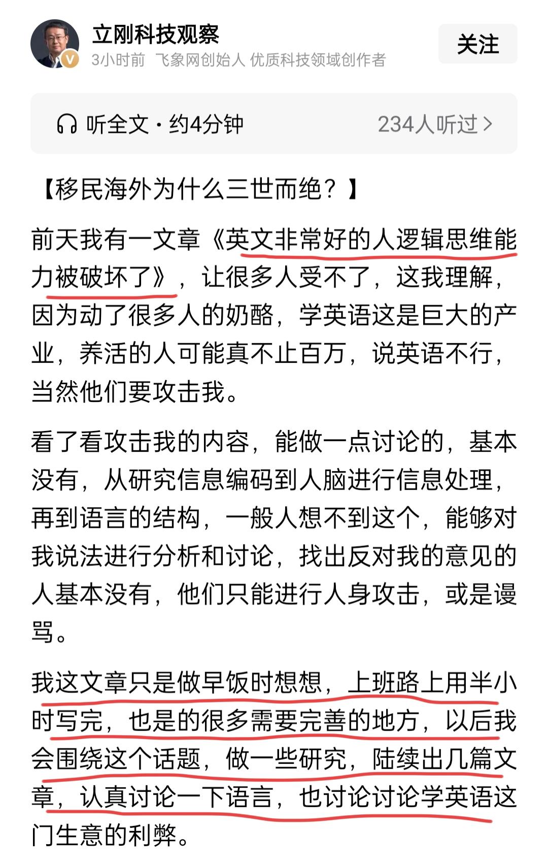 项立刚先生前几天写了一篇文章,谈的是英语非常好与逻辑思维能力之间的关系。从客观的角度来说,这篇文章是说不通的。不管是本国人,还是外国人学英语,英语学的好或非常好,其逻辑思维能力也是不差的。 项立刚先生的文章惹了很大的争议。经过两天的深思熟虑,项先生终于找到原因了。该原因就是项先生认为写的时间太短了,考虑不全面,还是在吃早饭的时候想想的。 项立刚对外放言说,他准备要深入研究一下这里面的东西。他认为做早饭时想的东西,还是有不足之处的。 这时候我们看到项先生又开始转移视线了,之前谈的是英语学习能力与逻辑思维的关系,当这个话题谈不下去的时候,又准备把话题放在学英语这门生意的利弊上面了。 项立刚先生的一番话,还是很有意义的。他想告诉的是:当我们谈一个话题处于劣势的时候,可以转移一下视线,谈一谈与此相关的话题,这样就避免了尴尬,也能让话题继续谈下去,以此促进双方的友好交流。
