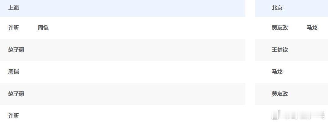 2025全运会乒乓球男团小组赛A组,上海vs北京出场阵容。第一盘:第二盘:第三盘:第四盘:赵子豪vs黄友政第五盘:许昕vs王楚钦