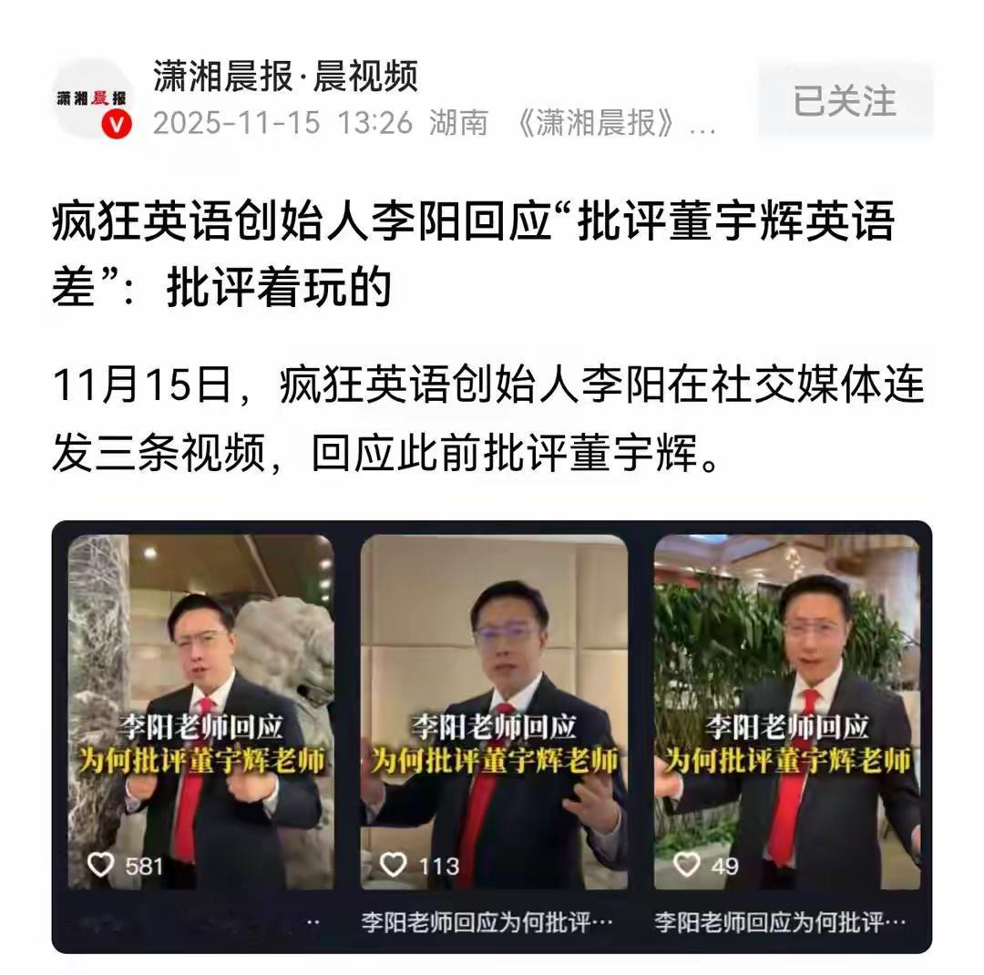 “英语纠风突然来袭!”疯狂英语李阳公开点名董宇辉:进博会口语漏洞多,劝其别带货,称卖货污染环境,结果反被网友围攻“蹭流量”,网友:语法有错不妨碍沟通,别拿环保当挡箭牌! 李阳在西安线下分享会拿出话筒,逐句指出董宇辉与外宾对话时主谓不一致、单复数混用,并顺带评价新东方教学水平,现场表示希望这段话登上热搜。 视频流出后,董宇辉已在评论区坦言自己口误多,欢迎指正,态度谦逊;网友则普遍认为,临时开口重在交流,揪语法属于吹毛求疵,且李阳选择公开点名,动机更像营销。 面对质疑,李阳于10月15日连发三条内容相近的视频回应,先称欣赏董宇辉,再强调对方是青少年偶像,英语示范意义重大,理应减少错误;随后列举两处具体语法问题,提醒考试会被扣分。 紧接着他话锋一转,建议董宇辉离开直播间,回归英语教学,理由竟是“社会不缺卖货,卖货等于包装,等于污染环境”,此言一出,弹幕再次炸锅,被指否定直播行业同时抬高自己。 李阳在视频结尾坚持认为,批评者才是真爱,自己只是出于教育初心;而多数观众看来,英语口误与环保议题并无因果,拿后者当说辞只会削弱说服力,公共讨论应回到事实本身。 对于这件事情,大家有什么看法?