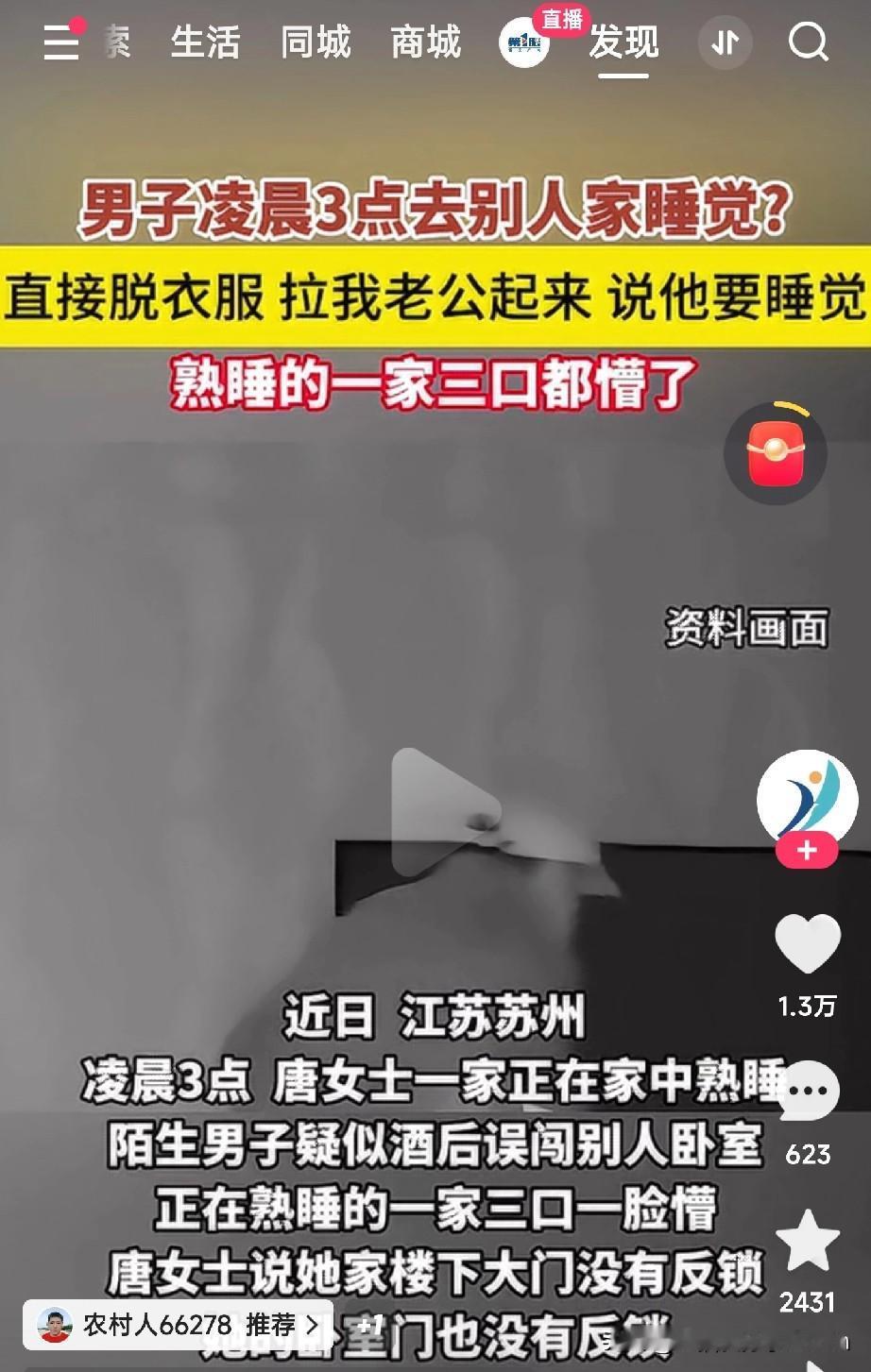 你家有睡前反复检查门锁的习惯吗? 见过走错门的,没见过这么“理直气壮”走错门的! 近日,江苏苏州,唐女士一家三口正在熟睡。凌晨三点,一名陌生男子竟打着手电,径直闯入他们的卧室! 接下来的一幕让所有人目瞪口呆:男子二话不说,开始脱衣服、脱裤子,然后上手拉扯唐女士的丈夫,嚷嚷着 “这是我家,我要睡觉了!” 被惊醒的一家三口彻底懵了。万幸,丈夫反应迅速,一把将男子按住,唐女士则立刻跳下床报警。 事后才知道,原因让人后怕:唐女士家楼下大门和卧室门,当晚都只是带上,没有反锁! 这才让疑似醉酒的男子“趁虚而入”。 这场荒唐剧的背后,是每个家庭的安全警钟! 这事太离谱了。 这是年度恐怖故事! 家门不反锁,就等于给意外留了一扇“邀请门”。 平安二字不值钱,直到意外到门前。 从今晚起,记得反锁门睡觉。 (文章素材来自观威海,侵删)