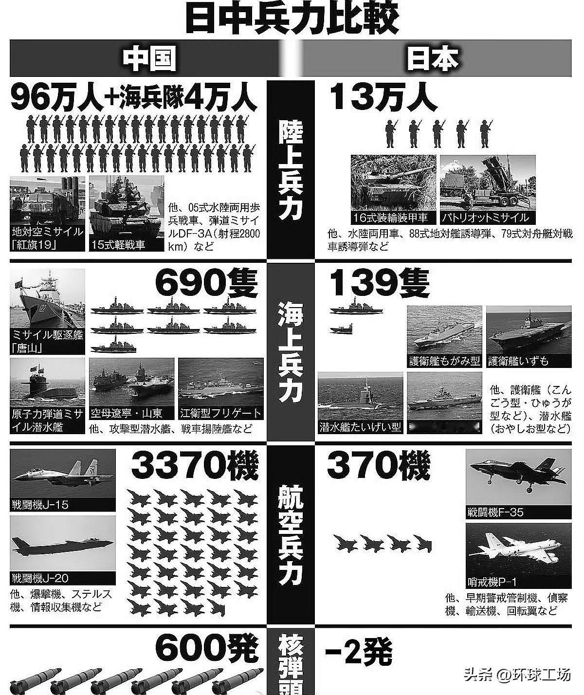 日本网友发的中日军力比较 刚刷到一个日本网友发的中日军机比较图,图中的数据不知道是以什么时间点统计的。明白人都能看出巨大的差距,不仅在于数据本身。不难看出通过这个对比得出启示,中日间从来不是"谁能打赢谁",而是"谁掌握自己的命运"。日本越想借美国之力遏制中国,就越会沦为战略棋子。你觉得,亚洲的和平应该靠"导弹实力"还是"合作共赢"?