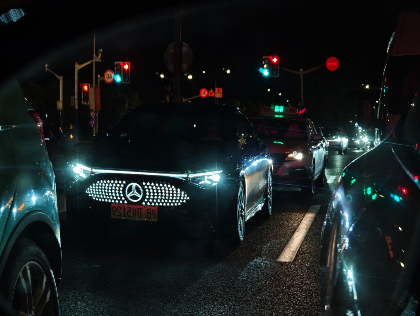 看到一辆奔驰CLA 300L,质感相当好啊只能在等红灯的时候在反光镜里拍一张晚上这灯光效果,辨识度极高