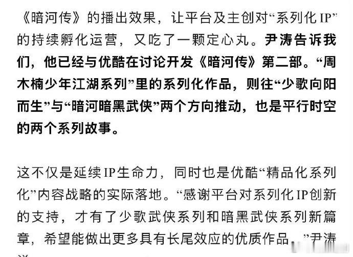 因为龚俊《暗河传》剧播成绩远超预期,尹涛透露已经和优酷讨论暗河第二部了