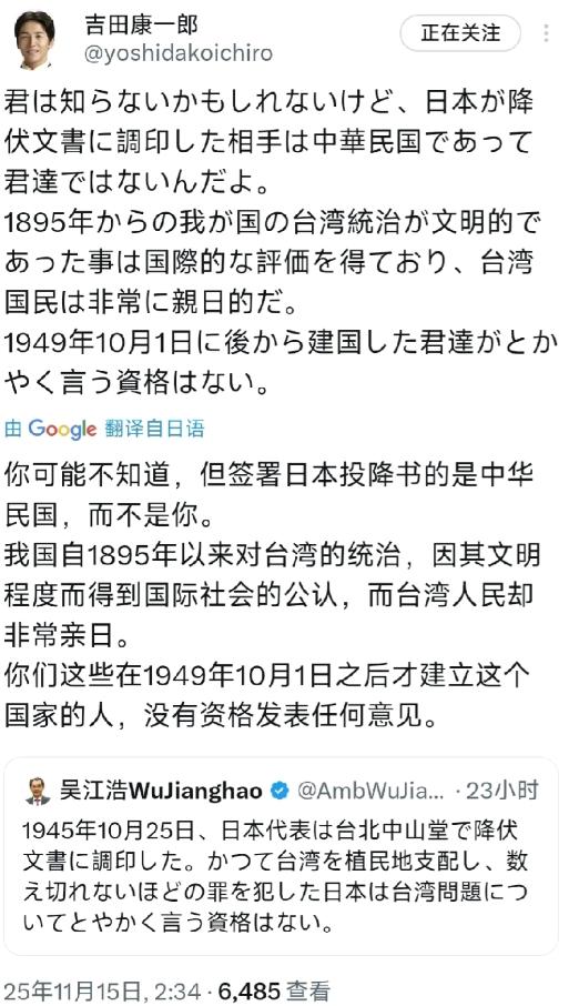 最新,日本议员11月15日,公开回应我驻日大使吴江浩:“你可能不知道,签署日本投降书的是中华民国,而不是你。我国自1895以来对台湾的统治,因其文明程度而得到国际社会的公认,而台湾人民却非常亲日。你们这些1949年10月1日以后才建立这个国家的人,没有资格发表任何意见。” 他为啥敢这么狂? 因为日本最近在台海周边的动作,早就不藏着掖着了。就在这两个月,日本自卫队居然借着 “民间交流” 的名义,跟台当局搞了第一次 “安全对谈”,明目张胆聊 “台海要是出事该怎么应对”,直接突破了以前 “不官方接触” 的规矩。 让人警惕的是,日本 2026 年的军费预算里,专门拨了 860 亿日元,要给冲绳、宫古岛的军事设施升级 — 扩建弹药库、加设监视雷达,明眼人都能看出来,这就是盯着台海准备的。 现在冲绳已经部署了 “战斧” 巡航导弹,射程够得到台海; 那艘叫 “加贺” 号的准航母,也完成了战斗机起降测试,明年就要派去西南海域盯着西太平洋。 这位议员此时跳出来放话,根本就是配合这些军事动作,想先从舆论上搅乱局面,为以后插手台海铺路! 再掰扯他吹的 “文明统治”,纯属把掠夺说成光荣, 1895 年《马关条约》把台湾割给日本后,日本在台湾搞了 50 年殖民统治,从头到尾就没干过一件 “文明” 事,全是抢资源、压百姓。 台湾本来是产米产糖的好地方,可殖民当局直接把 70% 的米和糖都运去日本,台湾人自己只能啃粗粮、饿肚子。 到了二战时更狠,粮食全由日本人统一分配,1945 年台湾稻米产量直接腰斩,缺口大到 20 多万吨,好多人连配给的粗粮都不够吃。 他们修铁路、建港口也不是为了台湾人,铁路只修到矿区,港口只建在产糖区,就是为了把台湾的矿产、粮食更方便地运回日本,把台湾当成自家的 “物资仓库”。 除了抢东西,还逼着台湾人忘本。 改日本名字、上学只准说日语,敢讲汉语就挨打; 二战时还强征 20 万台湾青年去当 “军夫”,近 3 万人死在战场上,还有数万名台湾女性被胁迫当 “慰安妇”, 一辈子都活在阴影里。 这哪是 “文明统治” 分明是赤裸裸的掠夺和压迫。 至于 “国际都认可” 的说法,纯属自欺欺人。 当年日本在台湾搞 “皇民化运动”,就是想让台湾人忘了自己是中国人,可反抗从来没停过。 1930 年的雾社起义,泰雅族人受不了压迫奋起反抗,日军直接用毒气弹、大炮镇压,600 多起义者全牺牲了,幸存者还被赶到指定地方一辈子受监视。 他说 “台湾人都亲日”,更是睁着眼睛说瞎话。 现在台湾年轻人喜欢日本动漫、化妆品,不代表认同当年的殖民历史。 最新的调查显示,越来越多台湾青年看清了 “皇民化” 的本质是文化掠夺,反而更愿意了解两岸同源的历史。 泉州的神尊入岛绕境时,数十万台湾信众跟着跪拜; 汉服社团在台湾高校遍地开花,大陆的影视剧、综艺节目在台热播 — 这些都说明,两岸的文化血脉根本割不断,少数人炒作 “亲日”,不过是想分裂国家的借口。 更值得注意的是,日本现在不光自己动作不断,还拉着别人一起搞事。 跟美国、澳大利亚、英国搞联合军演,在南海、台海周边晃悠,想建个 “包围圈” 针对中国; 还在联合国里歪曲说法,把台湾问题说成 “地区安全问题”,想让更多国家插手。 他们这么做,说白了就是想借着台海局势,突破和平宪法的限制,实现 “军事大国” 的野心,同时转移国内经济不景气、老龄化严重的矛盾。 可历史和现实都不会惯着这种野心。 183 个和中国建交的国家,没一个不承认台湾是中国的一部分; 联合国的文件里,从来都把台湾标成 “中国的省”; 就连日本自己的最高法院,1974 年也明确说过,台湾就是中国领土。 这些铁证,不是某个人的狂言就能推翻的。