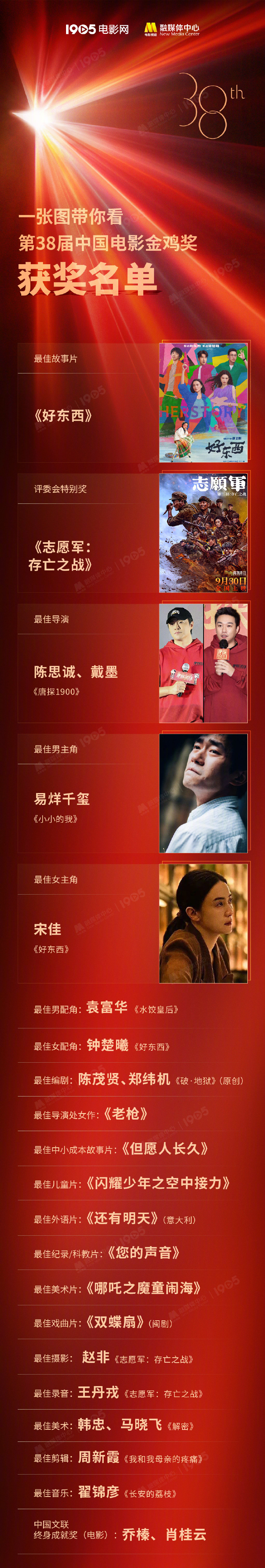 【】 最大赢家出现!第38届中国电影金鸡奖获奖名单出炉,《好东西》斩获最佳女主角、最佳女配角、最佳故事片奖项。最佳故事片:《好东西》评委会特别奖:《志愿军:存亡之战》最佳中小成本故事片:《但愿人长久》最佳导演处女作:高朋《老枪》最佳儿童片:《闪耀少年之空中接力》最佳纪录/科教片:《您的声音》(纪录片)最佳美术片:《哪吒之魔童闹海》最佳戏曲片:《双蝶扇》(闽剧)最佳外语片:《还有明天》(意大利)最佳导演:陈思诚、戴墨 《唐探1900》最佳编剧:陈茂贤、郑纬机《破·地狱》(原创)最佳男主角:易烊千玺(《小小的我》饰演刘春和) 最佳女主角:宋佳(《好东西》饰演王铁梅)最佳女配角:钟楚曦(《好东西》饰演小叶)最佳男配角:袁富华(《水饺皇后》饰演糖水伯)最佳摄影:赵非《志愿军:存亡之战》最佳录音:王丹戎《志愿军:存亡之战》最佳美术:韩忠、马晓飞《解密》最佳音乐:翟锦彦《长安的荔枝》最佳剪辑:周新霞《我和我母亲的疼痛》中国文联终身成就奖(电影):乔榛、肖桂云