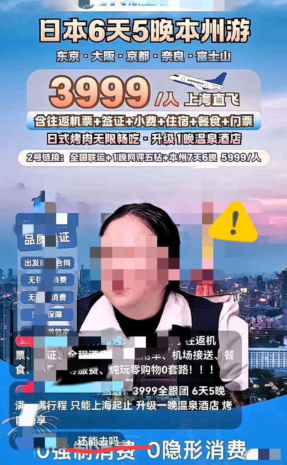 这些旅游社是想干嘛? 外交部都提醒别去日本了,航司也紧跟着出了免费退改政策,可某些旅行社还在直播卖赴日团! 国家都强调日本治安不靖,针对中国公民的违法犯罪案多发,安全风险直线上升,可这些旅行社眼里好像只有订单! 旅游的前提是安全,真出了意外,再多赔偿也换不回安心。 旅行社该做的是响应提醒、保障游客权益,而不是钻空子赚黑心钱! 你觉得该怎么约束这种无视安全的旅行社行为?