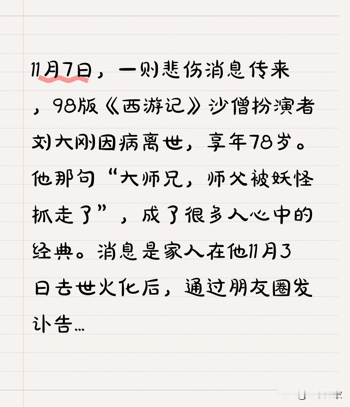 11月7日,一则悲伤消息传来,98版《西游记》沙僧扮演者刘大刚因病离世,享年78