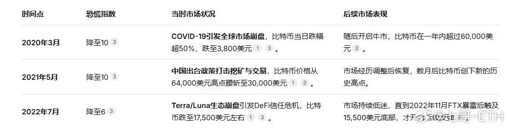 恐慌指数跌倒10,这种极度恐慌的情绪不常见,但同时也是行情重要的转折点。以往跌至10的情绪都是黑天鹅造成,而这次仅仅是因为老美一些对12月降息预期降低导致发生 。统计了下近年来跌至10和接近10的几次情况 以及后续的表现btc看完或许你会有所发现。毫无疑问情绪指标跌至低位的半个月或一个月内行情就出现了转折点,恐慌中往往酝酿着机会 。