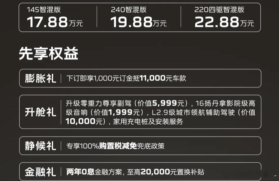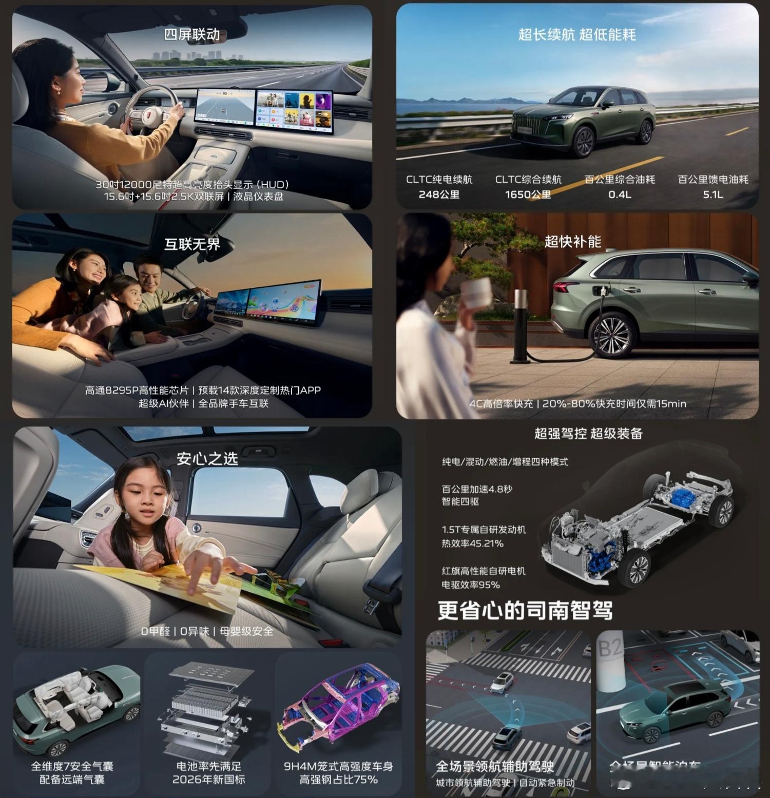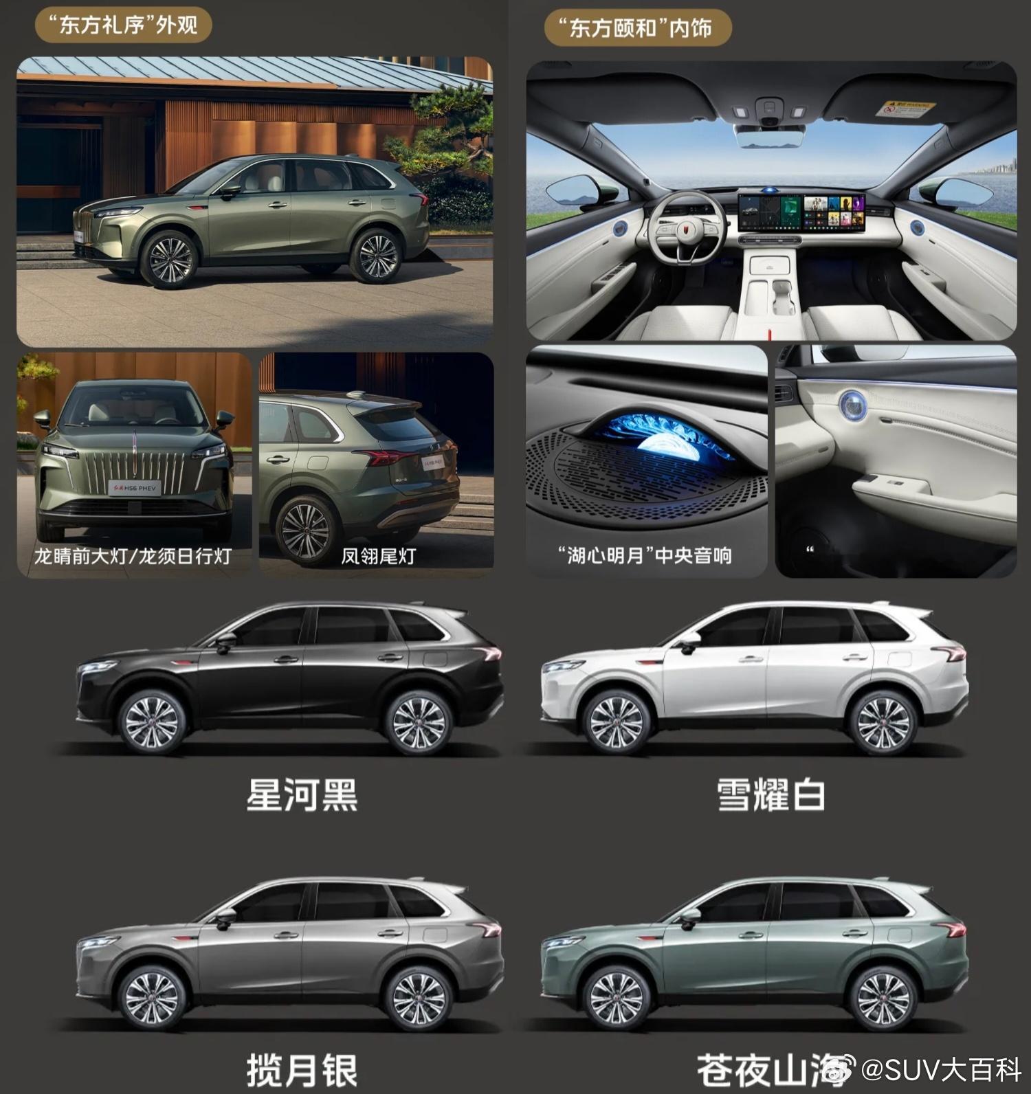 今晚开启预售,分为145/240/220四驱三款配置,预售价17.88/19.88/22.88万元外观-融合HS5和HS7的设计元素,车头采用“高山飞瀑”中网,12根镀铬线条代表祈年殿的12根檐柱,熏黑头灯配合下部家族式镀铬饰条,以及车头旗标,视觉效果典雅华贵侧面保留机械门把手,提供两种样式20吋轮圈和无框后视镜;尾部尾灯样式呼应红旗LOGO,锐利切面晶体与柔光渐变灯带交融,塑造独特光影层次长宽高4925/1970/1740mm,轴距2925mm,四种车漆-星河黑/雪耀白/揽月银/苍夜山海内饰-内嵌式小液晶仪表,搭配30吋HUD和双色三辐多功能方向盘,配备了中控副驾双15.6英寸2.5K联屏,内置高通骁龙8295P芯片司南智驾以视觉感知为主,功能包含全场景NOA、主动通过ETC闸口、拨杆变道、记忆行车、遥控/记忆泊车等功能,可做到行泊一体、无缝衔接配置提供四座通风/加热/副头枕、副驾电动腿托/老板键/零重力、丹拿音响、电尾门、后排靠背电调/放倒、三区空调、车内监控摄像头、面部识别、全景影像、车载香氛、方向盘加热、车载冷暖箱(2-50℃)动力搭载1.5T插混系统,发动机110kW,前电机168kW,后电机201kW(四驱),亏电油耗5.1L/100km,可选23/40度磷酸铁锂电池,支持4C超充,纯电/综合续航分别为148/1580km、248/1650km、228/1460km这价格你们觉得怎么样