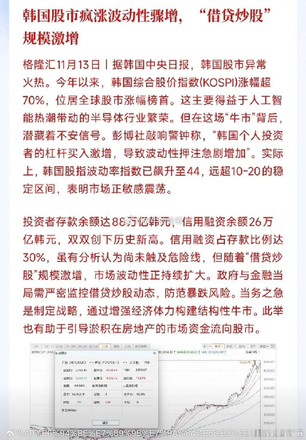 韩国股市已经疯狂,新一轮牛市下,散户疯狂的加杠杆韩国今年股市已经涨了69.30%,新一轮的牛市已经开始了,当然也刺激了更多的资金入场,对于散户来说加杠杆也疯狂起来,融资余额已经达到了26万亿韩元,相当于1257亿人民币。还记得A股2014年的杠杆牛,在2015年达到了5178点的最高点,然后就是杠杆牛被掐死,泡沫破裂,从5178点直接跌到了2600点,所有人的财富都缩水了一半。韩国政府已经意识到了风险,已经鉴开始在采取了措施,但是当股市已经疯狂的时候真的能够制止吗?这还是一个未知数。