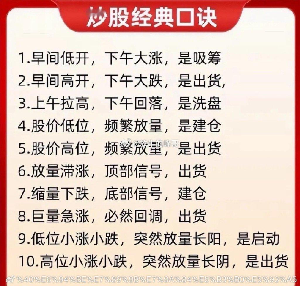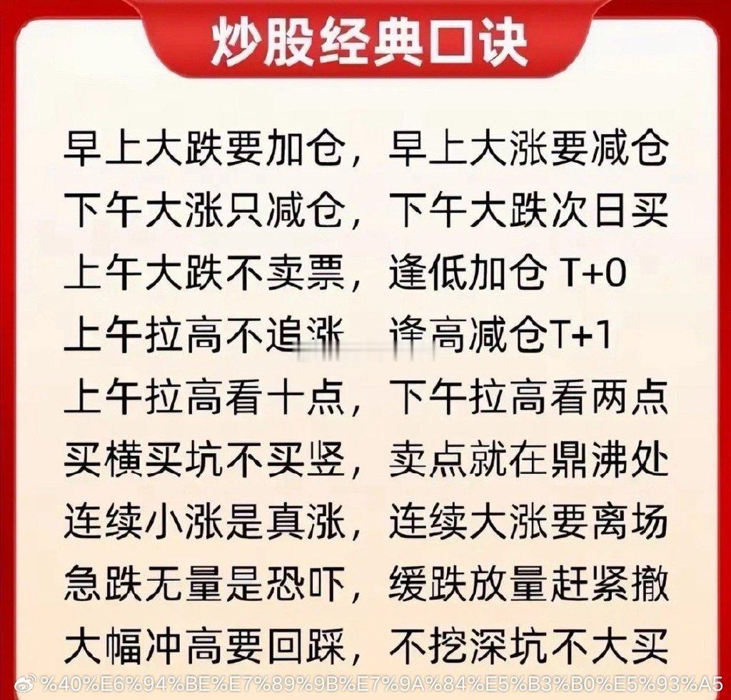 短线炒股口诀:1、趋势大票,回踩均线不破,是强势信号可以上车2、情绪人气票,冲高7点不涨停,马上远离3、任何票,低点不断抬高,果断上车4、任何票,低开3个点以下,5分钟不翻红,赶紧下车5、任何票,连板加速后爆量换手,留意机会6、任何票,连涨三天,下车一半先落袋7、任何票,在中高位缩量,放心上车8、任何票,股价不动,立刻下车、