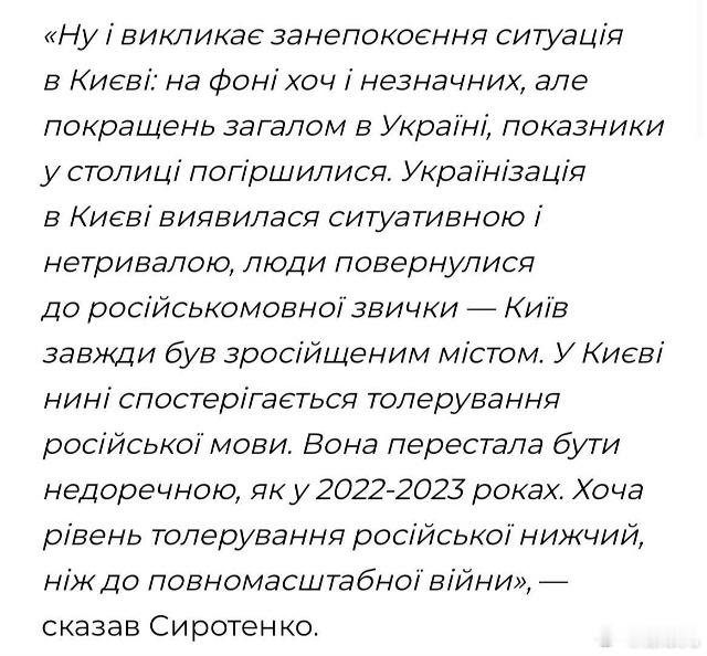 基辅的乌克兰化进程是暂时的和肤浅的 - 随着时间的推移,大多数城市居民已经恢复了通常的俄语交流,因为首都最初在很大程度上是俄罗斯化的 - 保护国家语言专员西罗滕科。他说,今天基辅对俄语的态度更加平静和宽容,不再像2022-2023年那样被认为是不合适的。