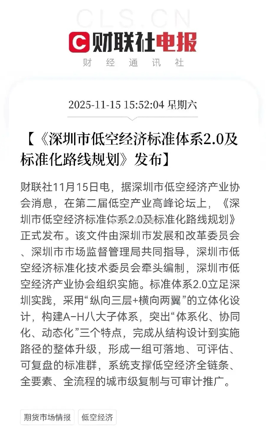 这一板块迎来利好!11月15日发布的深圳低空经济政策动态:《深圳市低空经济标准体
