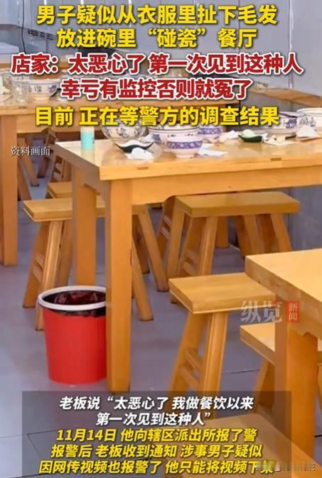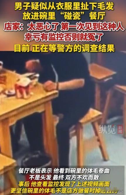 甘肃庆阳,一男子疑似在餐厅“碰瓷”,监控拍下其向碗里丢异物全过程。视频中,三人到餐饮店用餐,其中一男子吃了几口后,右手伸进衣服,16秒后疑似向碗里扔东西,翻找1分多钟后端碗走向吧台,同行人一口咬定是体毛,幸亏有监控。 11月13日,该餐厅,来了三个男子。 他们点羊汤时,付了十几元现金,又扫码付了几十元。 用餐时,一男子吃了几口,就右手伸进衣服,16秒后疑似往碗里扔了东西,翻找1分多钟后端碗到吧台,称碗里有体毛,要求免单还索赔,另两人一个帮腔一个沉默。 这突如其来的状况,让餐厅老板一脸懵。 老板仔细查看那根体毛,发现卷曲程度不像头发,心里犯起了嘀咕。 再一查看监控,画面里男子的小动作清晰可见,老板坚信这是碰瓷。 自己本本分分做生意,咋就遇上这种事。 14日,老板果断报了警,想让民警给自己一个清白。 可没想到,涉事男子也因视频报了警,老板怕影响生意,无奈之下只好下架视频。 现在,店方只能等民警调查结果。 有人觉得这男子太过分,为了点小利不择手段,破坏正常的经营秩序。 要是这种碰瓷行为得不到严惩,以后商家还怎么安心做生意呢? 店方正常经营,食材卫生、服务流程都严格把关,突然被这么一闹,生意受影响不说,声誉也受损。 涉事男子坚称碗里的是体毛,是餐厅卫生问题导致,自己只是正常维权,他们拿不出更有力的证据,监控画面又对他们不利,这说法显得有些苍白。 从法律层面看,这事不能光凭嘴说,在法律上,这将会涉嫌敲诈勒索。 根据刑法规定,敲诈勒索公私财物,数额较大或者多次敲诈勒索的,处三年以下有期徒刑、拘役或者管制,并处或者单处罚金。 男子以碗里有体毛为由,要求免单还索赔,若其目的是非法占有餐厅财物,且数额达到一定标准,就可能构成敲诈勒索罪。 如果他索赔金额较大,且没有合理依据,通过威胁、要挟等手段迫使餐厅就范,这就符合敲诈勒索罪的范畴。 餐厅老板查看监控后报了警,这是合理合法的维权行为。 根据治安管理处罚法,任何人发现有违法犯罪行为的,都有权利也有义务报案。 涉事男子因视频报了警,他觉得视频侵犯了自己的隐私权等合法权益,确实有权报警。 但前提是他得有证据证明视频存在侵权行为,视频只是记录了餐厅内发生的事实情况,没有不当剪辑、传播等侵犯隐私的行为,男子的报警理由,就不成立。 男子声称碗里有体毛,若真属实,餐厅是否要承担责任? 根据食品安全法,生产不符合食品安全标准的食品或者经营明知是不符合食品安全标准的食品,消费者除要求赔偿损失外,还可以向生产者或者经营者要求支付价款十倍或者损失三倍的赔偿金。 监控显示男子有疑似扔异物的行为,若能证明体毛是男子自己扔进去的,餐厅就无需承担赔偿责任。 目前,该餐厅老板,还在等待最终的调查结果中。 信息来源:男子向碗里丢异物“碰瓷”餐厅被识破?庆阳店主:幸亏有监控否则就冤了,已报警 2025-11-15 22:24·法治视讯