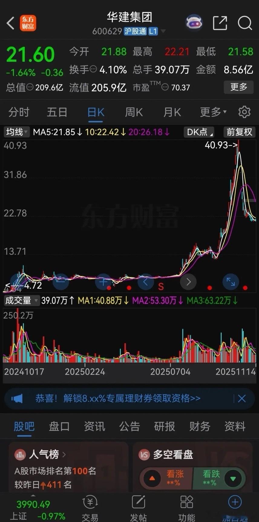 华建集团周五尾盘加速跳水,收盘股价报收于21.60元,不到一个月几乎腰斩了!公司股价一年上涨10倍,高位没人接盘,那就崩盘式下跌,跌到腰斩,让散户认为超跌了去抄底,进场的股民还以为抄了个大底。殊不知主力正在背后偷偷数钱呢,这个价仍然有五六倍的利润。这个价格就是再腰斩一次,主力也赚得盆满钵满。40追进去的股民这辈子别想解套!