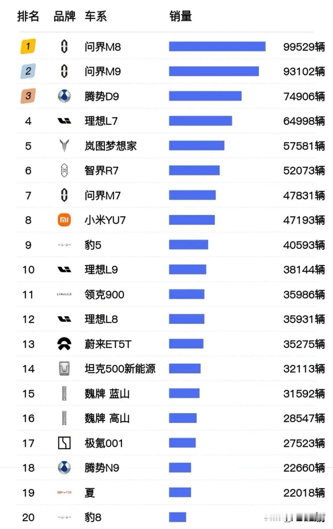 30万以上高端电车销量榜! 问界居然凭着M9和M7包揽冠亚军,关键是越贵卖得越好,腾势杀进前三当黑马,而曾经的流量王小米SU7才排第八! 先说说最让人服的问界,简直是高端市场的“价格刺客”反向操作!M9起售价46.98万,顶配都卖到56.98万了,结果上市72小时大定就破2.1万,现在还稳坐销量第一,这哪是卖车,简直是抢车啊!还有M7,31.98万的Max版比老款还贵一万,当初一堆人喊“退订”,结果5分钟订单破万、1小时冲3万,直接拿下第二。 为啥问界能做到“越贵越香”?我觉得核心就两点:一是华为的技术buff太顶了,ADS高阶智驾、鸿蒙智能座舱都是第一梯队,双腔空悬、大尺寸激光投影这些配置,比同价位BBA豪华太多,花30多万能享受到50万级的体验;二是定价策略绝了,Pro+版和Max版差价拉到4万,配置差异明明白白,预算够的想一步到位选Max,追求性价比的选Pro+也不亏,把不同需求的用户都拿捏了。而且车主口碑还特别好,净推荐值超高,口口相传直接带飞销量,难怪有人说买问界其实就是冲华为的技术和体验来的。 再看黑马腾势,这次居然挤到第三,真的让人惊喜!作为比亚迪和奔驰合资的高端品牌,有刀片电池、插混技术这些硬核背书,底子就够硬。就拿热门车型腾势09来说,三十几万的价格,冰箱彩电大沙发配置拉满,比GL8、赛那这些传统MPV良心太多,还能兼顾商务和家用,两个市场通吃,对手根本没的打,能冲到前三完全是实力使然。 最让人意外的就是小米SU7了,曾经的“网红神车”,话题度一直居高不下,结果这次才排第八。说实话小米的设计和性能都不差,但高端市场拼的不只是参数,问界有华为智驾加持,腾势有技术沉淀,反观小米在智驾生态和品牌溢价上,可能还需要再积累。不过也不用太着急,毕竟高端市场竞争太激烈,小米作为后来者,慢慢打磨产品和口碑,后续应该还有机会逆袭。