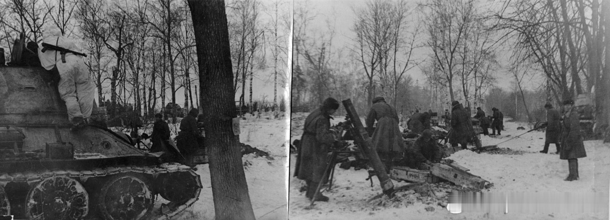 1944年1月19日苏军独立迫击炮兵第42旅迫击炮兵第588团Григори Афанасьевич Бурцев布尔采夫中尉在红谢洛附近阵地上,该团装备1938年式120毫米迫击炮,左侧是Т-34坦克