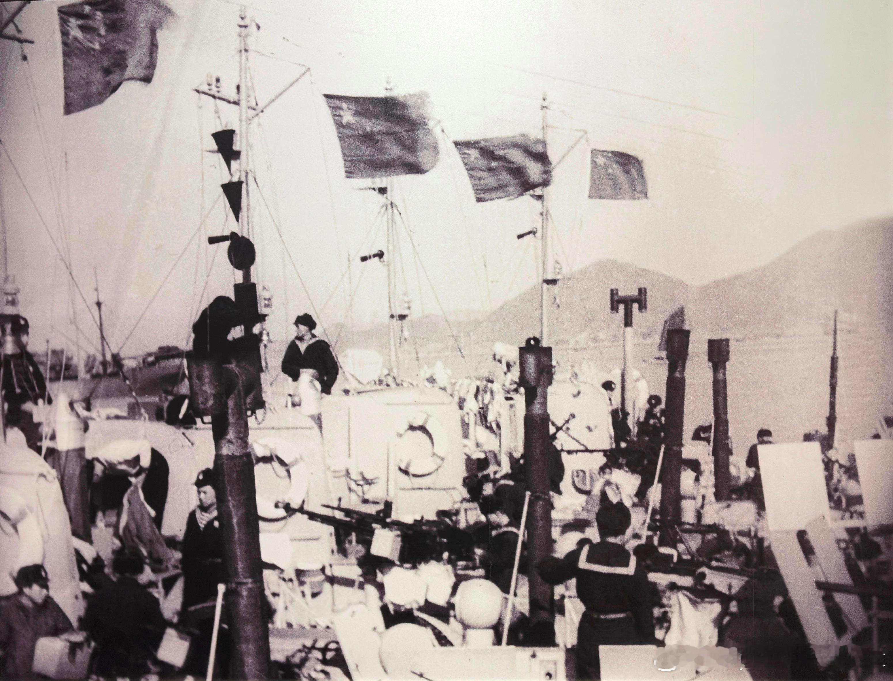 1954年海军抢修了头门山、蒋儿岙临时码头,检修了港湾码头设备舰船。这是海军某部指战员检查武器和机器设备