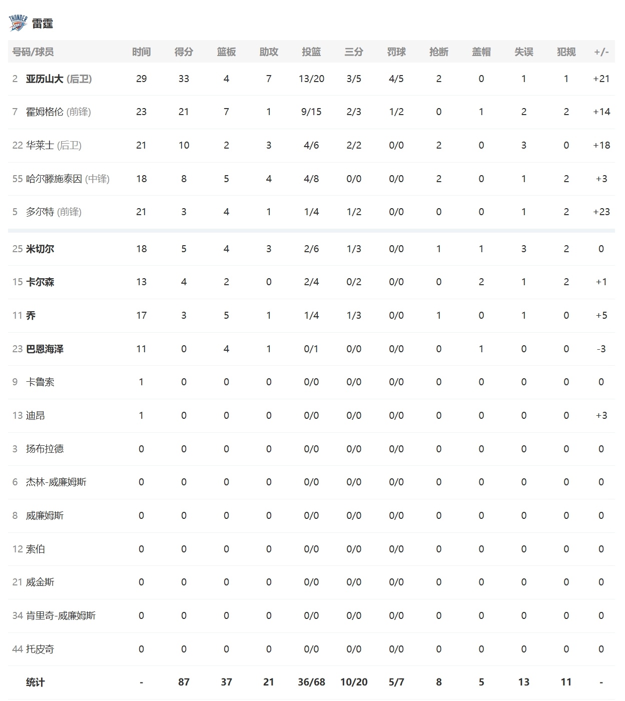 三节结束,雷霆87-70领先黄蜂进入最后一节!亚历山大20中13砍下33分4篮板7助攻2抢断,切特15中9得到21分7篮板,卡森华莱士10分3助攻2抢断,哈腾8分5篮板4助攻2抢断,米切尔5+4+3!