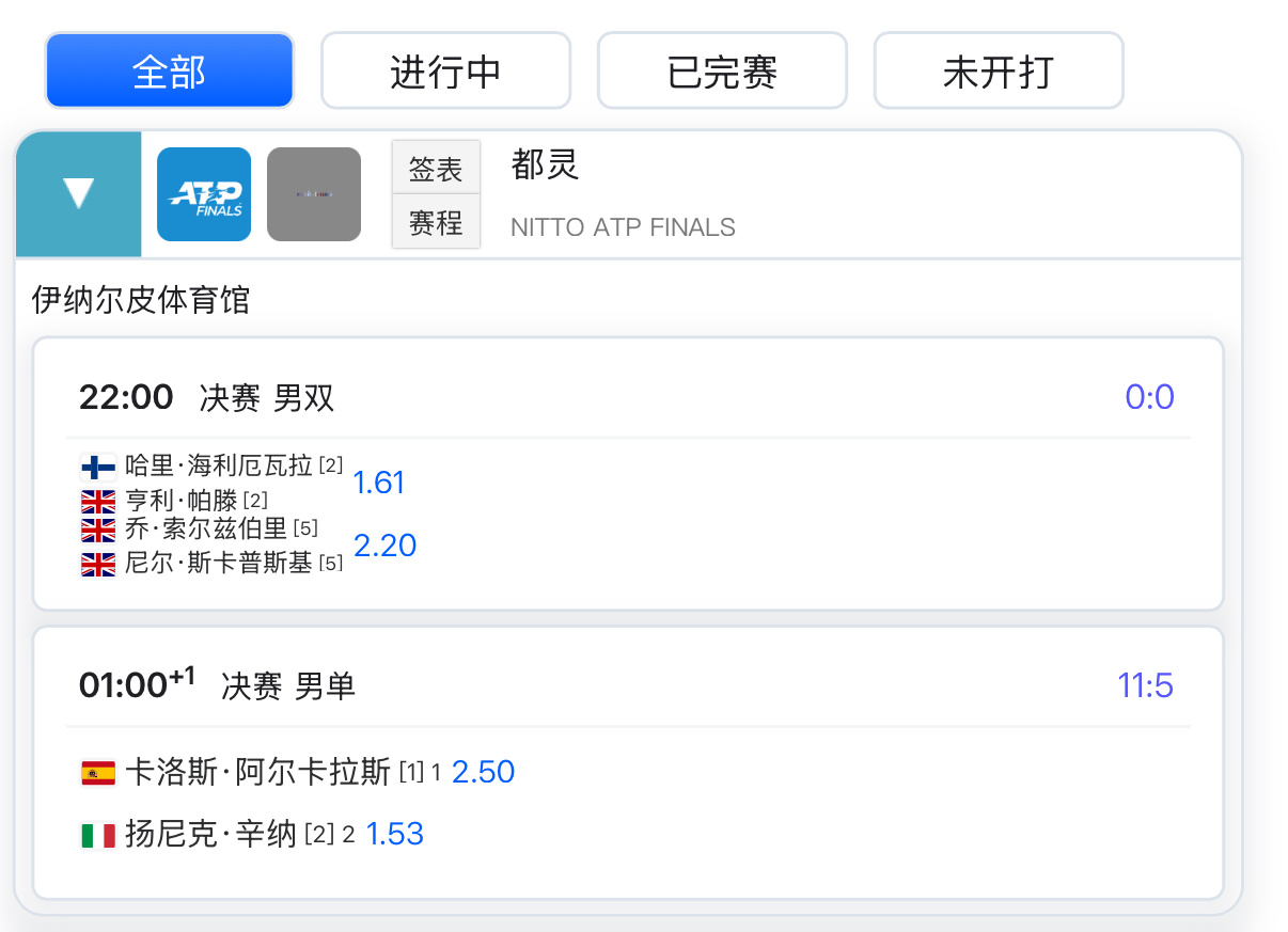 今日赛程⏰总决赛争冠战 ,凌晨一点,大家会熬夜看吗?🌙 网球项目最后一个周末,小商、王右坐镇中心球场。这次决赛是在周四工作日,但票依旧卖光了,所以不用上班的人还是挺多的是吗