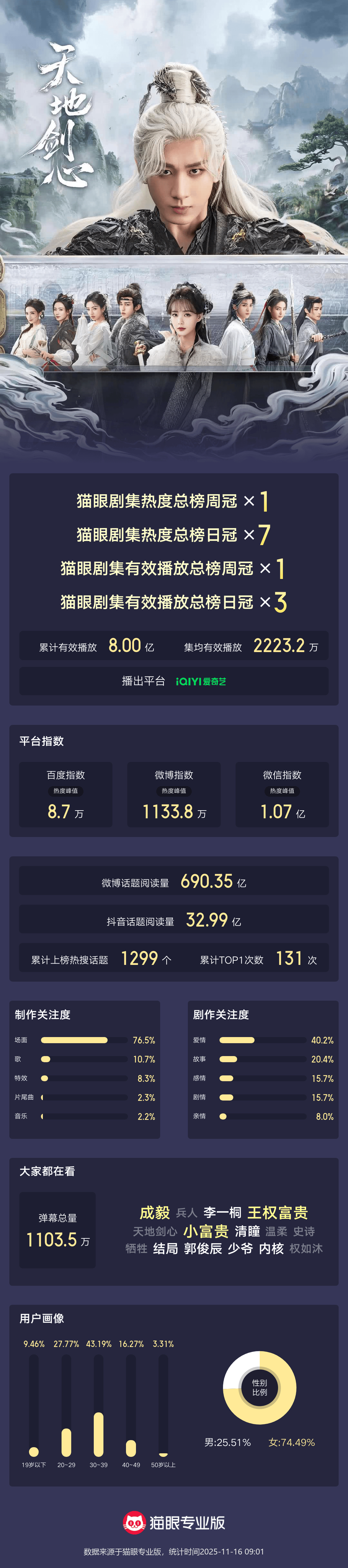 “天下非妖之天下,非人之天下,乃是众生之天下。”据猫眼专业版数据, 领衔主演网络剧《天地剑心》累计7次热度登顶收官。你追剧了吗?来一起盘点收官成就:猫眼剧集热度总榜周冠*1猫眼剧集热度总榜日冠*7猫眼剧集有效播放总榜周冠*1猫眼剧集有效播放总榜日冠*3