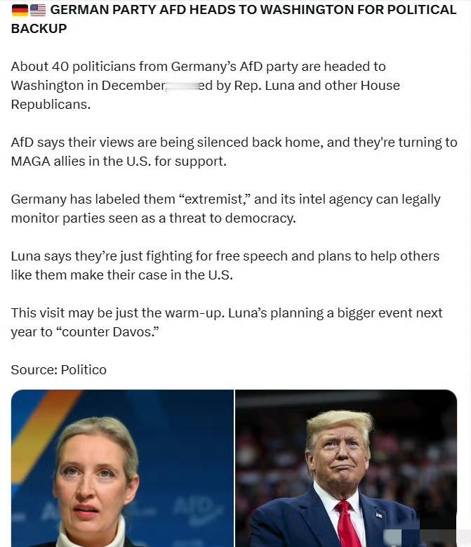 大约40名德国选择党(AfD)政界人士将在12月前往华盛顿,此行是应众议员露娜及其他众议院共和党人的邀请。 AfD表示,他们在德国国内被压制,因此寻求美国MAGA盟友的支持。 德国政府已将AfD贴上“极端主义”标签,情报机构也因此可以对被视为威胁民主的政党进行合法监控。 露娜则称,AfD只是为了争取言*自*,她计划帮助这些政客在美国发声。