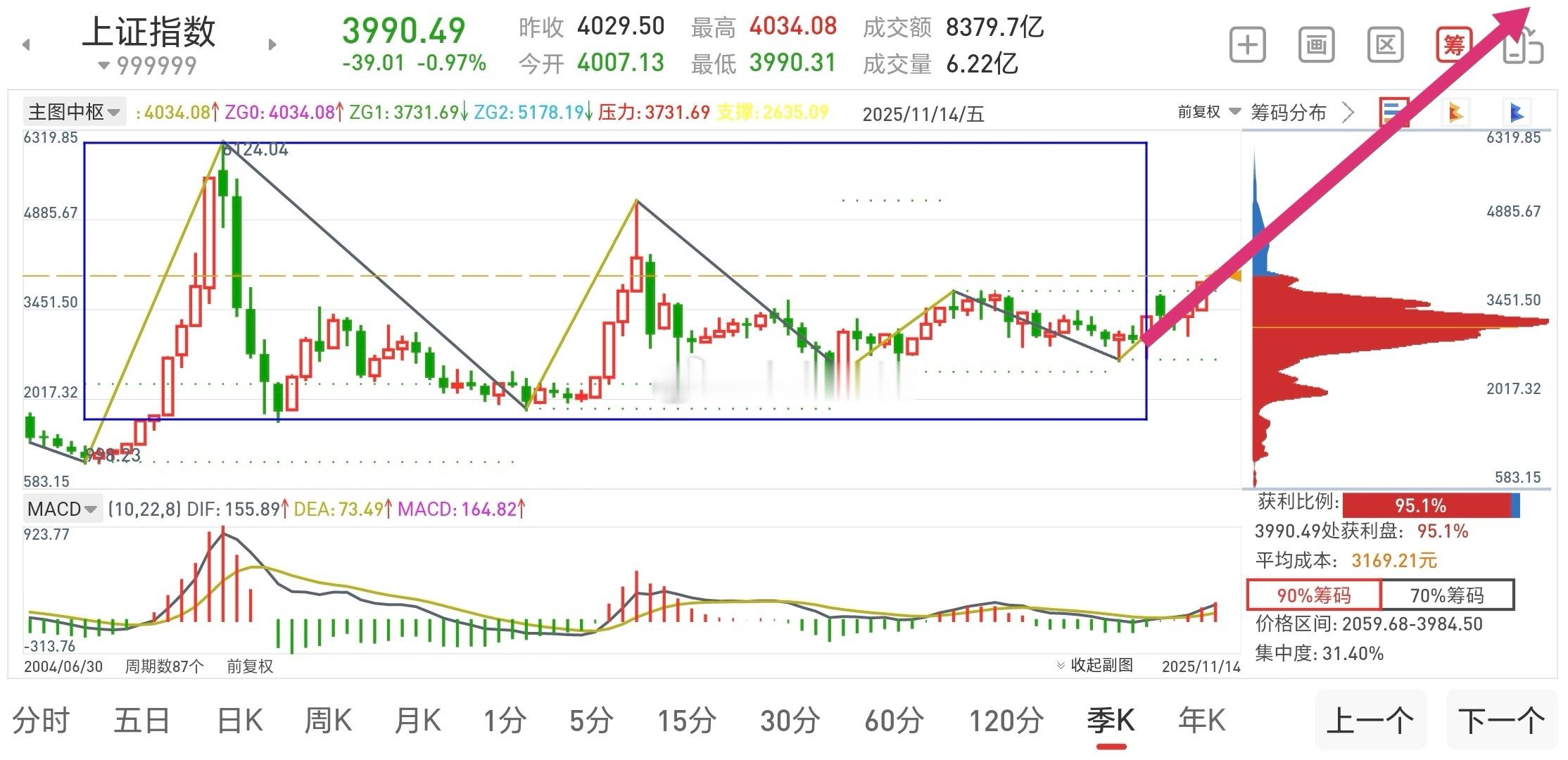 推演次轮行情上涨空间:从缠论季线中枢离开段的逻辑看,上证指数季线高点落在6124 - 7750点之间有一定技术推演依据,但并非必然结果,具体分析如下:1. 支撑看至6124点的核心依据 :上证指数季线存在以6124点、1664点均值3894点为中轴线的大级别中枢震荡区间。当前指数已站在中轴线之上属于强势震荡,且从走势结构看,2440点后大概率是季线中枢的上涨离开段。结合此前998点到6124点、1664点到5178点的走势规律,这波离开段突破6124点这个前高压力位是趋势延续的合理推演,同时季线MACD红柱持续,也为离开段突破提供了指标支撑。2. 上看7750点的测算逻辑 :按中枢区间校准法,若季线离开段有效突破6124点,目标高点可通过“前高 + 中枢振幅”测算。此前大中枢涵盖1664 - 5178点等区间,振幅约3500点,若取中枢振幅的1/2(1750)叠加6124点(1750+6124=7874)有机会触及7750点附近。另外参考历史上牛市突破长期通道上轨的幅度,2007年、2015年都显著突破通道上轨,若本次离开段延续这种强势,也存在向7750点冲击的可能性。3. 该区间的不确定性 :这个点位区间是理想状态下的推演,实际有诸多变数。比如当前3900点附近已触及长期上升通道的延伸压力位,若后续突破后承接力不足,行情可能在6124点前就出现回调。而且历史上6124点、5178点均出现过小级别背驰引发的大级别调整,若季线离开段内部出现背驰结构,也可能导致高点达不到7750点,甚至止步于6124点下方。(还有一个原因,目前是人为的控制涨跌节奏,走慢牛)时间周期:结合缠论季线中枢离开段逻辑和上证指数历史季线牛市周期规律,这波有望触及6124 - 7750点的行情,大概率还需3 - 5个季度,整体周期约8 - 10个季度,预计在2026年下半年到2027年初见顶 。具体依据如下:1. 历史牛市季线周期参照 :上证指数过往大级别牛市的季线上涨周期多为10个季度,比如2005年7月到2007年10月的牛市就刚好运行10个季度。而本轮行情若从2024年2月启动算起,截至2025年11月已运行7个季度,按规律推算还剩3 - 4个季度就能走完一轮完整上涨周期。2. 季线结构的时间信号 :从季线顶底分型结构来看,2023年底到2024年底已呈现5根季线,而完整的顶底分型结构至少需要7根季线,这意味着至少还需2根季线(即6个月)来完成结构,后续还可能因行情延续拉长时间,与前面历史周期推算的时间范围基本契合。3. 突破后的整理周期需求 :2025年10月上证指数才突破压制18年的长期下降趋势线,季线级别突破后通常需要1 - 2个季度进行巩固整理。这意味着行情不会立刻冲高到目标区间,会在整理后再逐步上攻,也让整体周期落到了上述推算范围之内。