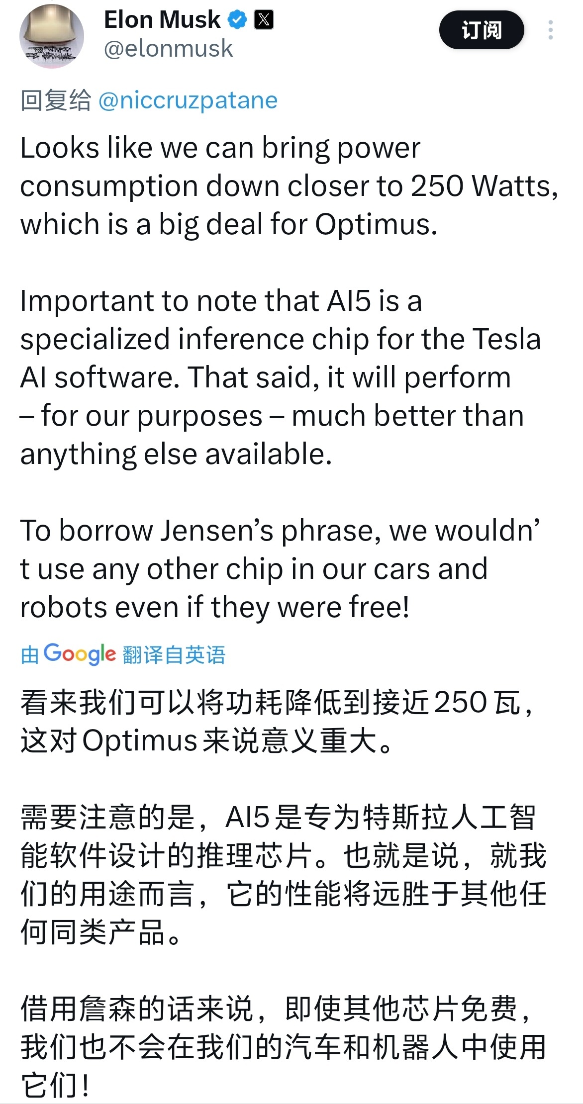 Elon Musk 证实:特斯拉正在尝试将 AI5 芯片的能耗降至 250W。没记错的话,HW3.0 为 100W,目前量产装车的 AI4 为 170W。没办法,要装在散热和供电都很苛刻的汽车尤其是机器人上,必须要极致的高能效,别无他法。
