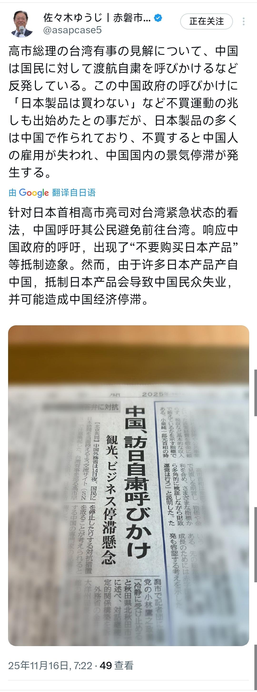 日本议员佐佐木裕二今天(11月16日)发文写道:“针对日本首相高市早苗对台湾紧急状态的看法,中国呼吁其公民避免前往日本。响应中国政府的呼吁,出现了‘不要购买日本产品’等抵制迹象。然而,由于许多日本产品产自中国,抵制日本产品会导致中国民众失业,并可能造成中国经济停滞。” 只能说佐佐木裕二这话说得跟没翻过中日贸易账本似的,把日本产品当中国经济的 “命门”,未免太看得起自家商品了。 先不说所谓 “抵制导致中国经济停滞” 有多夸张,单看数据就知道这说法站不住脚。2023 年中日贸易总额是 3180 亿美元,看着不少,但放在中国 41.76 万亿元的进出口大盘里根本不算啥 —— 中国对日本的出口额只占总出口的 4.7%,进口也才 6.3%,这点份额就算有波动,顶多是小涟漪,压根掀不起 “停滞” 的大浪。 再说所谓 “抵制导致中国民众失业”,更像是没摸透中国市场的老黄历。现在在华的日企确实不少,算下来得有 3.3 万家,像松下这样的大企业在中国还有 5 万名员工,但中国就业人口基数摆在那,这点岗位连百分之一都占不到。 而且真要是出现抵制迹象,最先补位的就是本土品牌,2012 年钓鱼岛事件后日系车在华销量暴跌 40.8%,但长城哈弗 H6 立马顶了上来,直接挤掉本田 CR-V 成了 SUV 销量冠军,那些原本给日系车配套的工人,转头就能进本土车企的车间,哪来的大规模失业? 早在上世纪二三十年代,“国货大王” 方液仙就带着 “三星” 牌牙膏、国产味精把日本 “味之素”、日产蚊香挤出了中国市场,那会儿不仅没失业,还催生出了一批民族企业,现在中国制造业比当年强百倍,更不可能被这点波动难住。 更关键的是,中日经贸早就不是中国离不开日本,反倒是日本更依赖中国市场。2023 年中国是日本最大的贸易伙伴,日本对中国的出口占比 17.6%,进口更是高达 22.2%,58% 的日企还计划 2025 年增加在华投资,说白了是日本企业更怕失去中国市场。 佐佐木只提 “日本产品产自中国”,却不说这些日企赚的钱大部分要回流日本,中国拿到的只是加工费和就业岗位,真要是调整供应链,中国有 4 亿中等收入群体撑着内需,日本企业可找不到第二个这么大的市场。 比起佐佐木的夸大其词,高市早苗的言论才是真的捅了马蜂窝,这可是中日邦交正常化以来头一回有日本首相敢公然对中国发战争威胁。 她在国会说 “台湾有事” 是日本的 “存亡危机事态”,暗示要武力介入,这已经不是简单的摩擦了,直接踩破了一个中国原则的红线。 要知道过去就算有钓鱼岛这样的争端,双方也都憋着劲用外交渠道解决,从没说过要动武,连日本前首相石破茂都忍不住说,历届政府都不敢讲这么明确的话。 高市这波操作说白了就是为右翼势力站台,从参拜靖国神社到否认南京大屠杀,再到现在拿台湾问题挑事,每一步都在往军国主义的老路上蹭。 她心里门儿清台湾是中国的核心利益,偏要把 “台湾有事” 和日本的集体自卫权绑在一起,无非是想借台海问题扩军,可这一下就把地区和平的火药桶给点了。 国际社会都看明白了,有网友直接说她 “沉迷于把世界推向战争”,这哪是邻国该有的样子? 中日经贸那点联系是 “压舱石”,但再结实的石头也经不住有人天天拿锤子凿,高市早苗要是继续这么闹,别说经贸合作了,地区稳定都得被她搅黄,这才是真正的祸根。