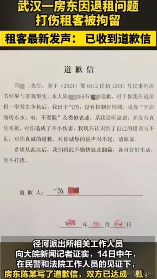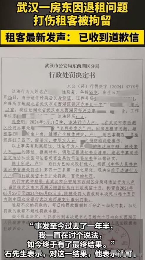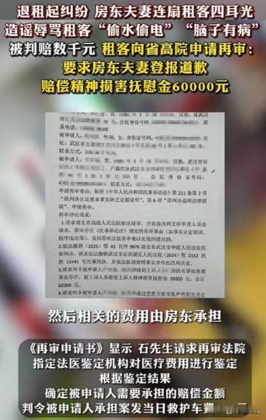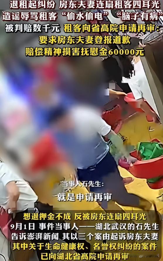 湖北武汉,一男子只是想提前退个租,结果押金没退成不说,竟被房东丈夫当场连扇四个大耳光,还遭辱骂偷水偷电、脑子有病。这事一闹就是三年,男子不服气,把房东夫妻告上法庭,最终上诉到湖北高院,索赔6万元精神损失费,还要求登报道歉。 2022年,石先生租了间门面开美发店,签了三年合同,押了2500元。 石先生精心装修店面,买设备,准备大干一场。 到了2024年5月,却不尽如人意,一直处于亏损状态,石先生感觉再这么下去,损失会更大,便打算提前退租止损。 他觉得提前退租虽然违约,但押金是自己的钱,应该能退回来。 于是,石先生找房东谈退押金的事。 这一谈,就起了冲突! 房东丈夫卢某某情绪一下子失控,上来就扇了石先生四个大耳光,这四个耳光打得石先生脑袋嗡嗡响,脸上火辣地疼。 卢某某还不解气,对着石先生辱骂起来,说石先生偷水偷电,脑子有病。 骂完还不算,还让人拍照,想留下所谓的证据。 石先生很委屈,自己本就是受害者,怎么还被这样对待。 石先生觉得自己的权益受到了严重侵害,必须讨个说法,从那之后,三年间他打了三场官司、上两次庭、申请一次再审。 这期间,他停掉了生意,专心应诉。 为了打官司,石先生四处收集证据,交材料。 每一次开庭,他都紧张又期待,希望能得到一个公正的结果。 可这官司一打就是三年,其中的艰辛只有他自己知道。 直到2025年11月14日,房东陈某写了书面道歉信,石先生接受了。 石先生觉得,虽然这道歉来得有点晚,但至少对方承认了错误。 打人者卢某某赔了近6000元医疗费,押金也全额退还给了石先生。 可石先生索赔的6万元精神损失费,没有被支持。 这让石先生有些失落,他觉得自己受到了精神上的伤害,应该得到相应的赔偿。 法院驳回再审申请的理由有三: 一,打人这事公安已经处理过了,卢某某被拘10天罚200元,民事赔偿也判了,不用额外再赔精神损失。 石先生觉得这处罚太轻,不能弥补自己的精神创伤。 二,房东陈某辱骂情节不重,没大范围传播,没导致石先生名誉大跌。 石先生认为,虽然辱骂没有大范围传播,但对自己的心理伤害是实实在在的,不能因为传播范围小就不赔偿。 三,石先生自己发视频曝光,播放量不低,主动传播削弱了名誉受损的说法。 石先生觉得自己曝光是为了让更多人知道真相,维护自己的权益,不能因此就不支持精神赔偿。 法院提醒,道歉执行靠协商,不成走程序。 这让石先生有些无奈,他觉得协商可能又会陷入扯皮,走程序又不知道要耗费多少时间和精力。 这事说明,维权得靠法律,曝光只是辅助。 石先生通过法律途径维护自己的权益,虽然过程艰难,但也有了结果。可这精神赔偿的问题,还是让他心里有个疙瘩。 石先生认为自己遭受了身体和精神上的双重伤害,应该得到精神赔偿。而法院从法律角度,依据相关证据和规定,认为不符合支持精神赔偿的条件。 要是在现实中遇到类似情况,该怎么解决呢? 如果被人殴打,首先要及时报警,让民警来处理,固定证据。 要是身体受伤了,要赶紧去救治,保留好医疗费等相关票据。 要是对方辱骂自己,造成名誉受损,也可以收集证据,比如证人证言、录音录像等,然后通过法律途径维护自己的权益。 可以依据《民法典》中关于名誉权的相关规定,要求对方停止侵害、赔礼道歉、消除影响、恢复名誉,如果造成严重精神损害,还可以索赔精神损失费。 有人认为:石先生提前退租违反合同,房东不退押金应该合理,石先生是不是该忍下这口气呢,毕竟自己违约在先。 虽然石先生提前退租可能违反合同,但房东可以通过合法途径解决,比如扣除相应违约金,而不是采取打人、辱骂这种违法行为。 打人、辱骂这些行为举动,侵犯了石先生的人身权利和名誉权,这是法律所不允许的。 最终,打人者赔了近6000元医疗费,押金全额退还,但精神赔偿,没有被支持。