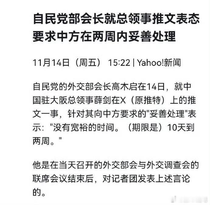 小鬼子放马过来吧:自民党部会长就总领事推文表态要求中方在两周内妥善处理。日本这政客简直就是颠倒黑白,我方不和傻狗摔跤,就是要针对高市早苗介入台海谬论进行发力,现在是旅游警告,后续可能别的上强度。后续可能就是琉球群岛的问题了。你看美国都可以提出加拿大和格陵兰岛要归入美国,我们在小日子不承认台湾归中国,那么我们就要对等提出琉球不该归入日本管理的问题。日本要打破二战秩序,我们满足他们