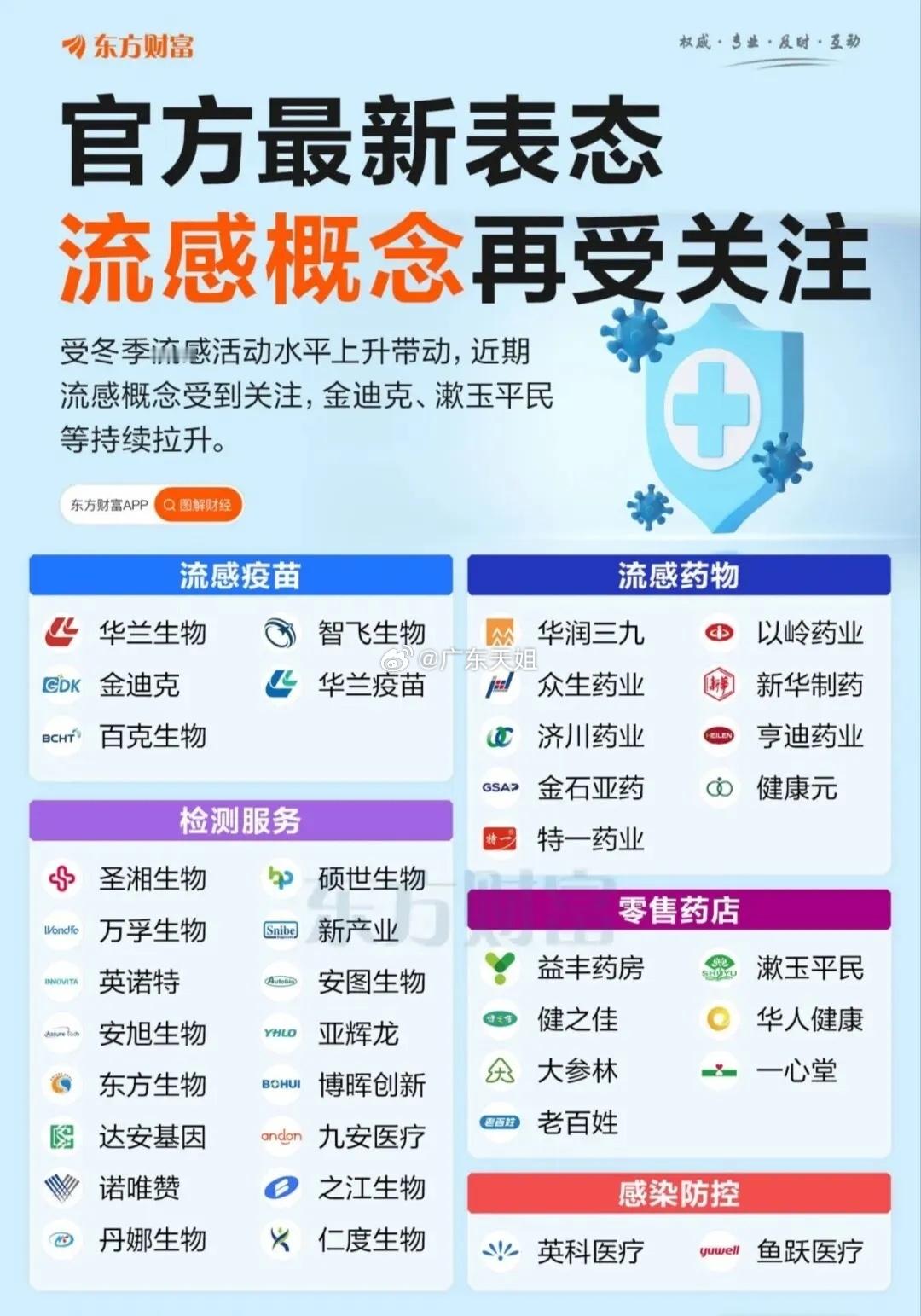 流感高峰提前两周压境,流感产业链迎来估值重构窗口期!近日,国家疾控局预测2025年流感高峰将提前至12月中下旬至1月初(较往年提前两周),且当前甲型H3N2亚型占比超95%。H3N2毒株传播效率较去年提升30%,而中国人群对该毒株的免疫背景薄弱,交叉免疫力普遍较低。全国23个省份已进入中流行水平,南方疫情强度高于北方,医院呼吸科/儿科门诊量环比增超30%,奥司他韦等药物出现断货,反映医疗资源承压。1.众生药业(002317):核心产品昂拉地韦为全球首款PB2靶点抑制剂,通过“抢帽”机制在病毒复制初始阶段阻断RNA聚合酶,对奥司他韦/玛巴洛沙韦耐药株具强抑制力(耐药率仅1.6%,低于玛巴洛沙韦的9.7%)。临床数据显示其症状缓解时间较安慰剂缩短39%,达峰时间仅0.5-2小时(玛巴洛沙韦需4小时)。已启动医保谈判,叠加GLP-1减肥药管线协同,成为中线资金布局标的。2.济川药业(600566):玛硒洛沙韦(济可舒)主打“单次服药”便利性,3期试验显示病毒RNA转阴时间仅41.4小时,儿童剂型填补市场空白。定价320元/盒定位中高端,耐药性优于传统药物。与征祥医药合作开发,获批后快速铺货,受益于疾控局“药物储备强化”政策。终端断货潮推动渠道补库存需求。3.东阳光(600673):奥司他韦国内市占率64.8%,虽因集采丢标面临压力,但产能弹性(24小时生产)保障应急供应。国家将奥司他韦纳入战略储备,公司满负荷运转承接订单,医院渠道需求激增(儿科门诊量+30%)。4.华兰疫苗(301207):国内最大流感疫苗企业,年产能1亿剂,四价苗占比超80%。2025年批签发量增长12%,且国家将批签发周期从60天缩至45天,加速上市。10月以来多地四价苗断货,公司订单同比激增(社区医院单日接种量达400人)。疾控部门呼吁高风险人群补种,接种率提升5.3个百分点。5.金迪克(688670):专注四价流感疫苗,2025年前三季度营收增99%。流感高峰提前触发接种潮,公司近期一批次疫苗获签批发许可。南方省份高流行强度利好区域渗透。6.华润三九(000999):999感冒灵覆盖“预防-治疗-康复”全链条,渠道渗透率超80%(50万家药店),品牌认知度构筑护城河。奥司他韦断货下,中药缓解症状需求上升,叠加冬季呼吸道疾病高发,OTC药物销售环比增30%。7.以岭药业(002603):连花清瘟循证医学证据充分,对H3N2病毒抑制率达68%,且纳入多版诊疗方案。多地建议中药储备应对流感,公司产能利用率升至90%。8.特一药业(002728):止咳宝片为核心单品,镇咳疗效明确。流感高发期咳嗽症状高发,产品终端需求骤增。流感高发期咳嗽症状占比超70%,产品终端断货率高达60%。9.国药股份(600511):配送网络覆盖全国,奥司他韦等紧缺药物周转加速,区域龙头业绩弹性显著。10.英科医疗(300677):口罩、消毒湿巾需求季节性增长,医院感控采购量回升。11.英诺特(688253):呼吸道病原体多联检产品(含流感/RSV)获批,15分钟出结果。疾控中心强化监测要求,发热门诊筛查量上升,3Q25营收预增40%。12.达安基因(002030):流感病毒核酸检测市占率30%,适配基层医院设备。疫情地图每日更新推动检测需求。13.博瑞医药(688166):作为奥司他韦原料药核心供应商,公司采用酶催化工艺实现纯度99.5%以上,成本降低30%。当前奥司他韦终端断货,药企24小时生产带动原料药采购激增,公司产能利用率达95%以上。14.科伦药业(002422):奥司他韦颗粒剂型独家覆盖低龄儿童,通过一致性评价抢占基层市场。公司全产业链布局保障紧急供应,近期承接多地政府储备订单。15.百克生物(688276):全球唯二鼻喷流感减毒活疫苗,通过黏膜免疫实现三重保护,接种便捷性提升儿童覆盖率。新品液体剂型2025年8月获批,产能扩张至1000万剂/年。16.康缘药业(600557):热毒宁注射液对甲流病毒抑制率61.3%,纳入《流感诊疗方案》重症用药。近期多家三甲医院采购量翻倍,弥补奥司他韦短缺缺口。17.热景生物(688068):流感/RSV联检试剂获CE认证,15分钟检出限低至100拷贝/mL。天津RSV疫情提前爆发,医院筛查订单环比增300%。18.东方生物(688298):纳米微流控芯片技术实现呼吸道12联检,自动化设备适配基层医院。国家强化哨点监测,发热门诊检测量同比增150%。19.人民同泰(600829):东北最大医药商业企业,覆盖黑龙江80%三级医院,奥司他韦区域配送份额占60%。短缺药品配送溢价提升毛利率至9.5%。