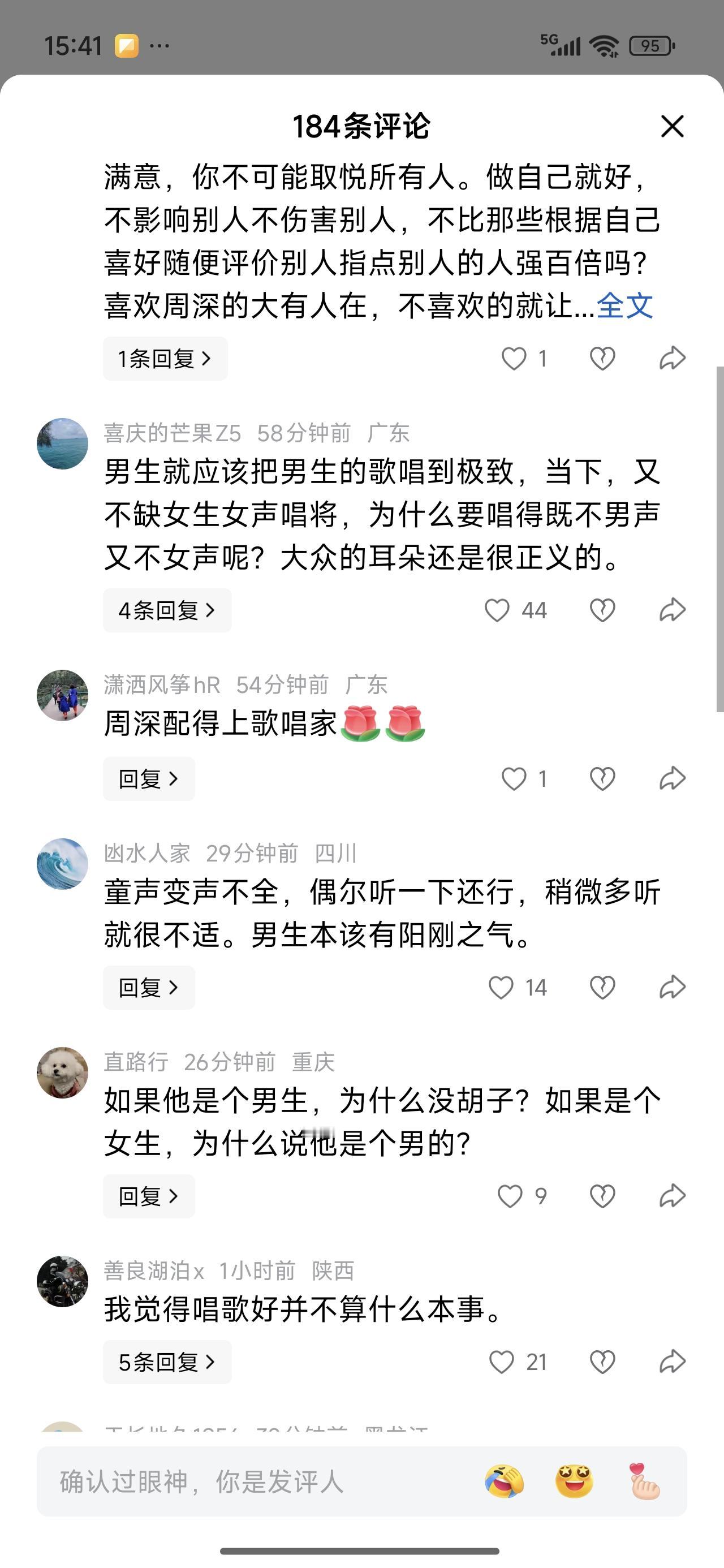 周深还是没忍住,最近回应了大家的疑惑。 周深说:我永远不会成为所有人心目中的中国唱将,但是在我心中,我对得起每一首歌,我站在每个舞台,化的每一个妆,都是从我心里面去化的。 其实,大家吐槽你的,不是你的歌唱实力,而是你过于女性的装扮。 声音是个人的,他好努力,那么难唱,难记的歌词都能记住。这是一个歌手的专业。对得起每一次上台,尊重每一位观众。但妆容可以趋向于男性化一点。 有个问题是周深没有喉结,所以,再化的女性一些的妆容,很难分辨出他是男的还是女的。 作为公众人物,应该有清晰的定位,而不是模棱两可的。你说是吧?给大众一个良好的引导。周深