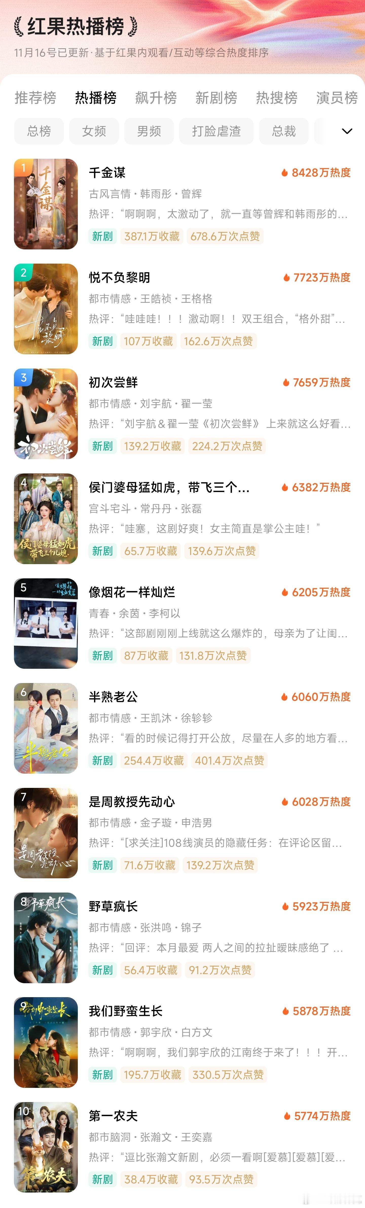 11.15竖短云合和红果热播榜:初次尝鲜8730万云合登顶。千金谋8428万热度红果登顶。