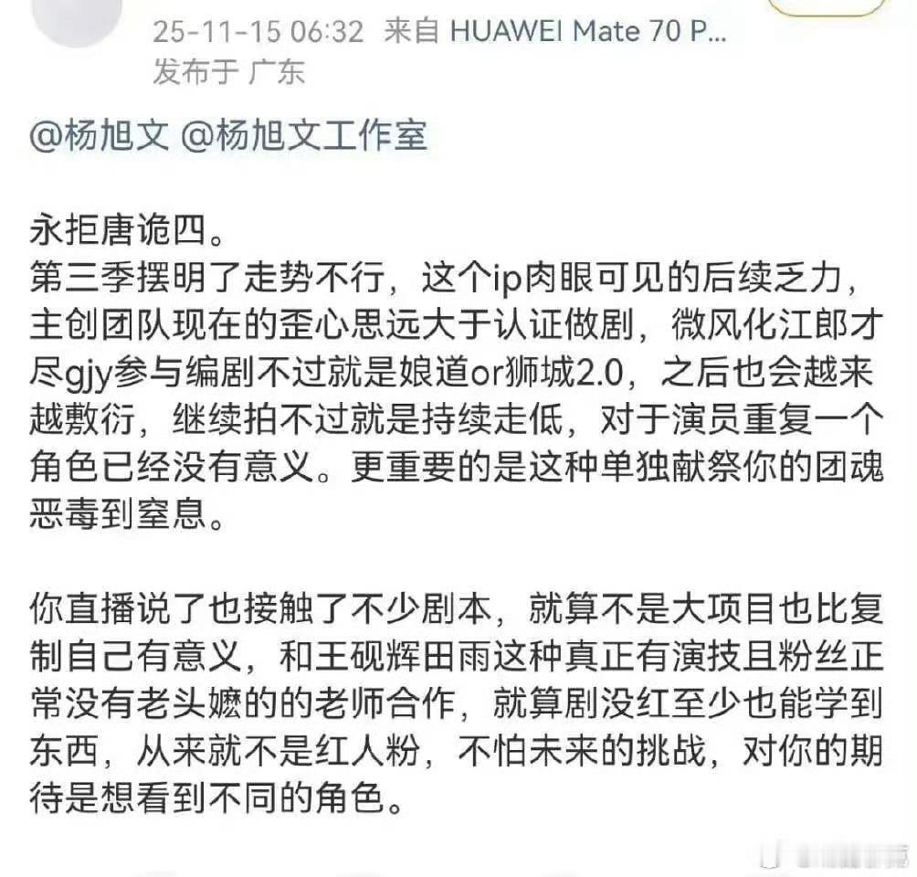 杨旭文粉丝永拒唐诡4。虽然唐诡系列确实走向末路了,但杨旭文离开唐诡,在内娱差不多是查无此人的水平了