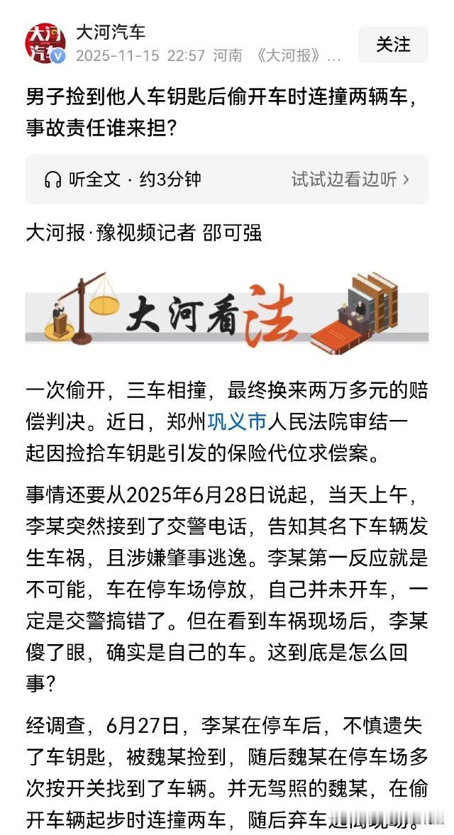 河南巩义,魏某捡到车钥匙后找到了对应车辆,于是决定偷开过过车瘾,谁知车子刚启动就