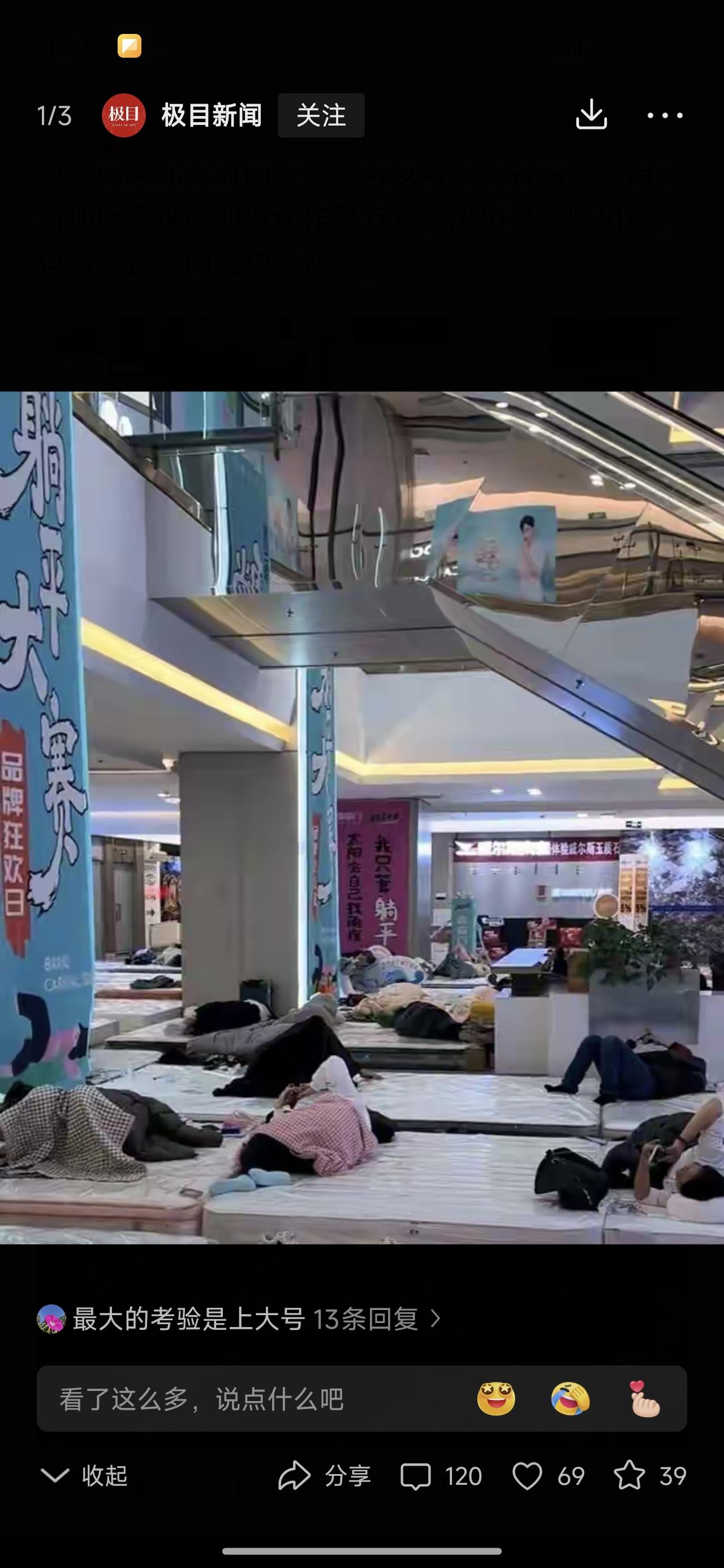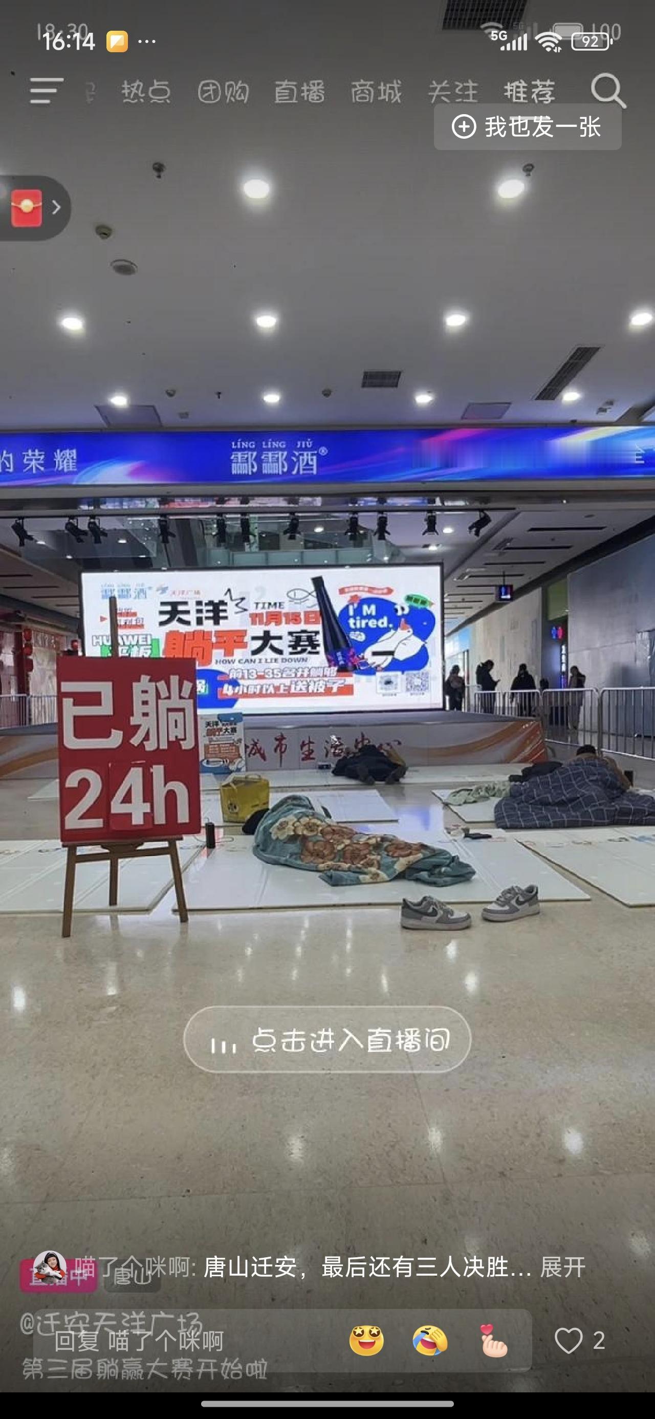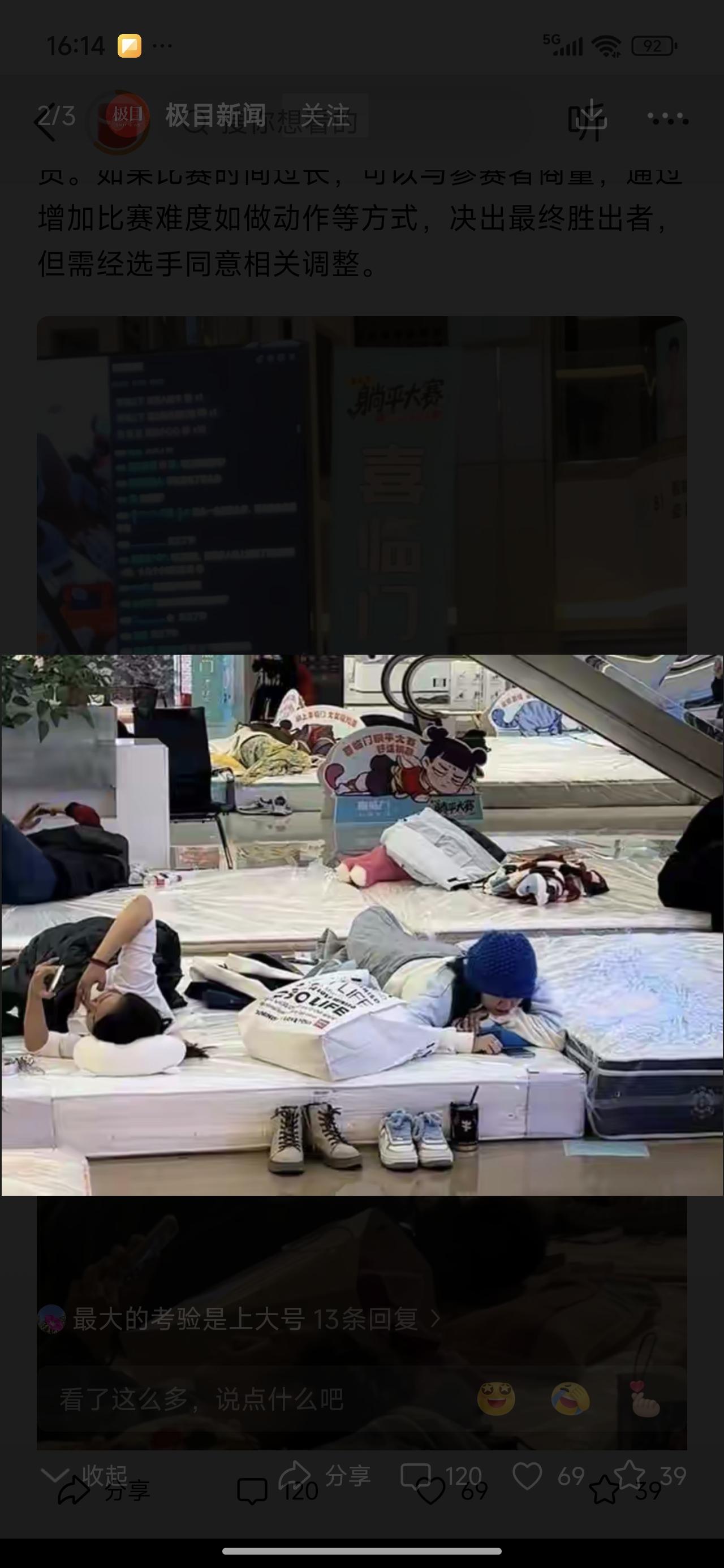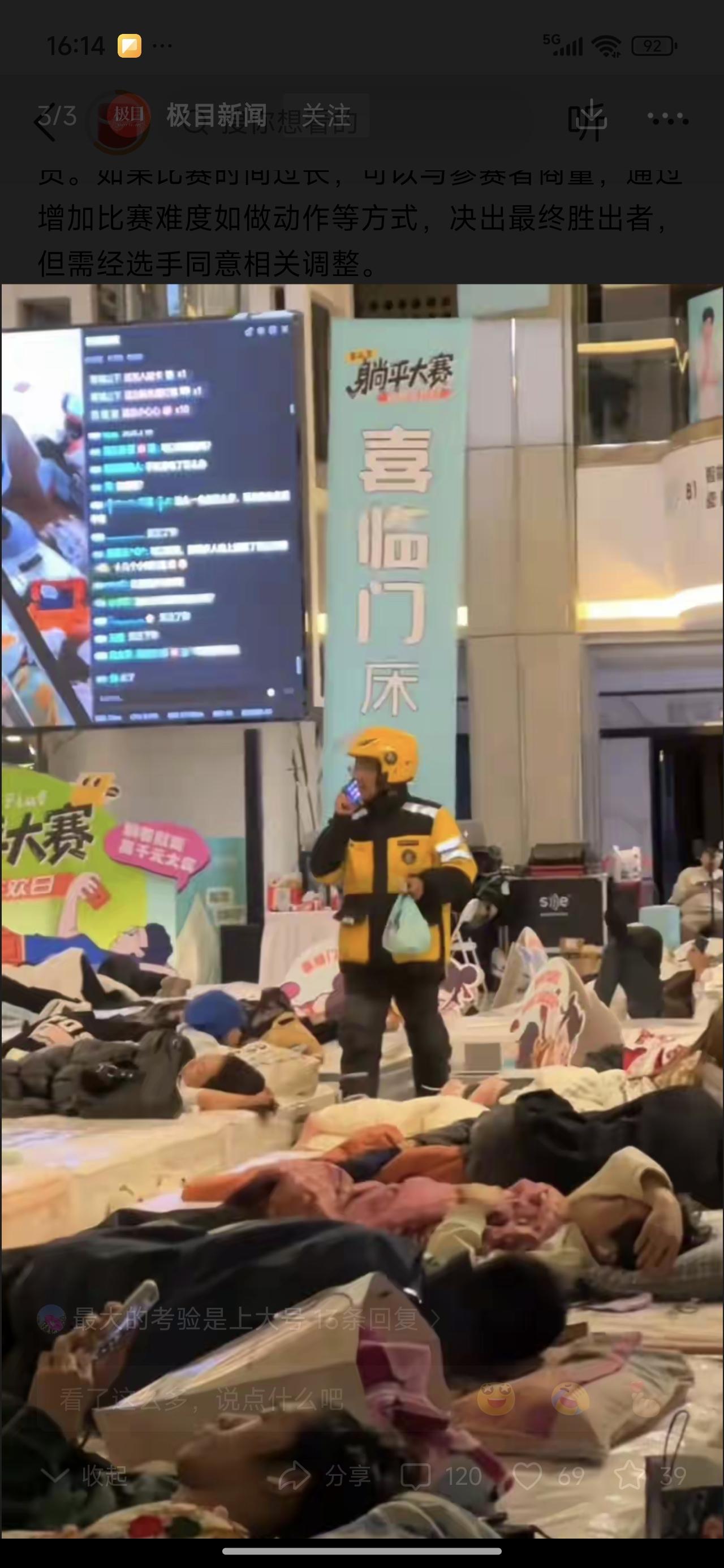 躺平大赛,醉适合你的大赛来了! 躺着就行,可以吃,可以叫外卖。但只能躺着趴着吃。不能坐起来。这次的奖金设置比较低。 那个冷美人就是曾经的躺平冠军。奖金好像是十万。都是狠人啊!你来不来?适合不? 女的可以穿纸尿裤,但也不能多喝水。一片纸尿裤可承受不了多少水的。男的就比较方便了,可以尿壶接一下。 有没有必胜诀窍?有人说便秘的可以躺好几天。真是笑死人了。这算不算作弊啊啊哈哈
