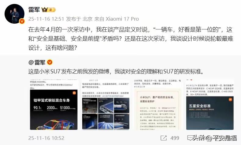 雷军,怒了!刚刚连发多条微博 熟悉雷军的人都知道,这位科技圈的“劳模”向来以温和、克制的形象示人,就算面对市场竞争的刀光剑影,也很少在公开场合动怒。可这次他是真的忍不住了,一口气翻出2023年到2024年的四则旧微博截图,直接喊话“网上有不少人断章取义、歪曲抹黑”,字里行间满是委屈和愤怒,这波硬刚也让全网瞬间炸开了锅。 争议的导火索,是一句被刻意切割的言论。有网友把雷军谈产品定义时“一辆车好看是第一位的”这句话单独拎出来,配上“小米汽车好看比安全重要”的解读大肆传播。可稍微了解完整语境的人都清楚,雷军紧接着就强调了“安全是基础、安全是前提、安全高于一切”,好看是产品的加分项,安全才是不可动摇的底线,这种断章取义的操作,无疑是在故意制造对立。 雷军之所以这么愤怒,不止是因为被曲解,更因为小米汽车在安全上的投入,本就是实打实的硬实力。为了打造SU7的安全防护,小米直接对标了2024版C-NCAP五星、2023版Euro NCAP五星及C-IASI 3G+三大严苛标准,从被动安全到主动安全,从电池安全到隐私安全,构建了四重保护网。车身用的是MI铠甲笼式钢铝混合结构,高强度钢和铝合金占比高达90.1%,最高强度能达到2000MPa,整车扭转刚度更是冲到了51000N·m/deg,这种强度在同级别车型里堪称顶尖。 电池安全这块,小米更是下了血本。自研自建电池包工厂,搞出14层物理防护、17层高压绝缘,还有7.8㎡的双大面主动冷却和165片气凝胶隔热材料,甚至首创了电芯倒置技术,就是为了热失控时让喷射方向远离乘员舱,实现“无明火、无热蔓延”。电池包不仅过了IP6K9K的顶级密闭测试,还扛住了超1000项安全测试,这个测试项目数可是国标的20倍,这样的投入和成果,怎么可能是“重颜值轻安全”? 其实这已经不是小米汽车第一次陷入舆论争议。之前就有碳纤维前舱盖“功能未达预期”、SU7 Ultra马力被OTA限制的讨论,有博主分析,这些争议很多时候是营销语境和用户期待的错位。雷军习惯了手机行业的参数化宣传,强调“赛道基因”“纽北纪录”这类亮点,却没料到汽车作为高客单价产品,用户对功能兑现的要求更苛刻,一旦宣传措辞不够清晰,就容易引发误解。 但这次的断章取义,显然超出了正常争议的范畴。雷军的个人IP向来以“真诚”“接地气”圈粉,他想通过微博和用户“交朋友”,却没想到这份真诚反而成了被攻击的靶点。互联网时代,流量至上的逻辑让一些人热衷于制造对立、曲解原意,只要能博眼球,哪怕断章取义也在所不惜,这种做法不仅伤害了企业和消费者,更污染了网络环境。 雷军连发微博自证,本质上是在捍卫品牌的底线和自己的初心。小米造车从零起步,230天达成10万辆下线的成绩背后,是无数研发人员的心血,而安全作为造车的核心底线,更是不容被歪曲抹黑。他的愤怒,是对恶意抹黑的反击,也是对所有为小米汽车付出的人的交代。 当然,流量时代的公众人物和企业,在宣传上确实需要更严谨。工信部早就发布了《汽车组合驾驶辅助功能宣传规范》,禁用夸大术语,这也提醒所有车企,宣传不能只追求噱头,更要注重信息的准确性和完整性。但严谨不代表要容忍恶意抹黑,面对断章取义的攻击,勇敢站出来澄清真相,反而更能赢得尊重。 各位读者你们怎么看?欢迎在评论区讨论。雷军 雷军爆火发言 小米雷语 雷军 雷军凡尔赛发言 雷军情商 雷军普通话 雷军直播间封禁