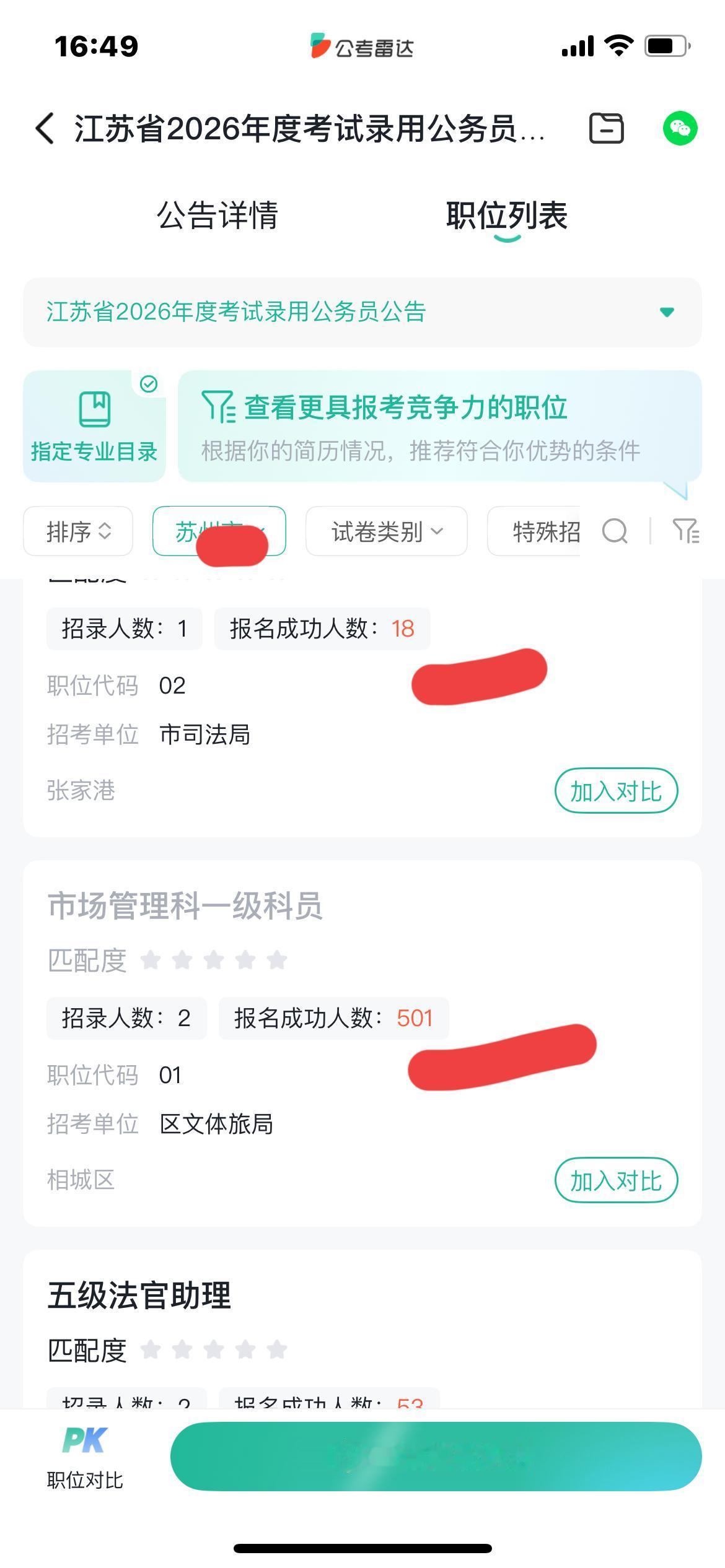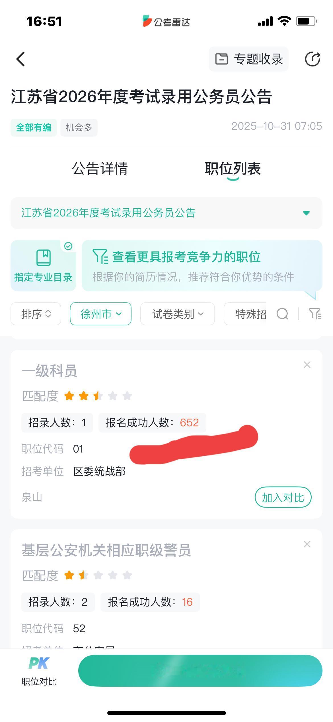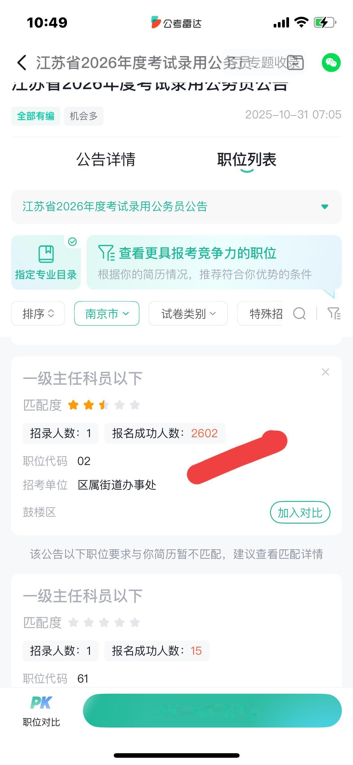 2026年江苏省考南京一岗位招一人出现破2000人的岗,是鼓楼区的区属街道办,专业不限,性别不限,不限户籍,俗称的三不限,人数高达2602人! 为啥出现那么多人报,主要南京是江苏省会城市,是经济文化中心,又不限户籍! 而同样报考无锡,苏州的岗位不限专业,不限性别,但本科往往限户籍,研究生才不限户籍,导致没有破千的岗位! 苏北的岗位,如徐州同样三不限的岗 由于经济不如苏南地区,今年的山东省考,河南省考,在江苏在同一天,所以没了巡考大军,也没出现破千的岗
