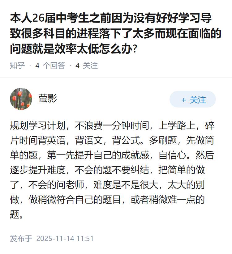 本人26届中考生之前因为没有好好学习导致很多科目的进程落下了太多而现在面临的问题就是效率太低怎么办?
