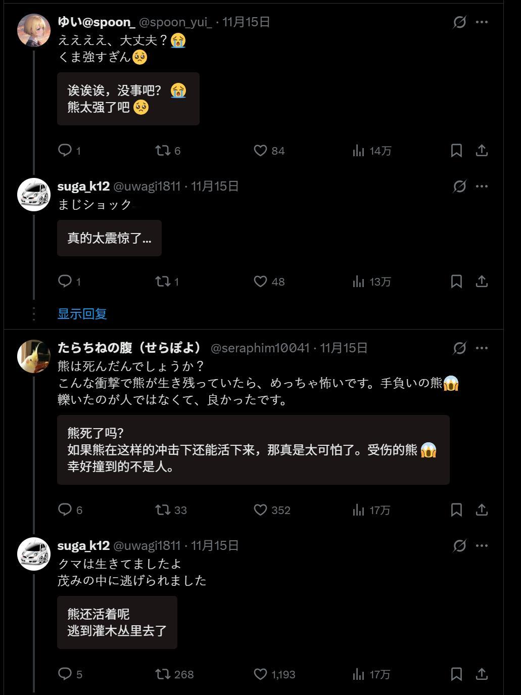 🔻日本网民分享:“车撞上了熊”。🔻有人问他:“熊死了吗?”🔻他说:“熊还活着呢,逃到灌木丛里去了。”